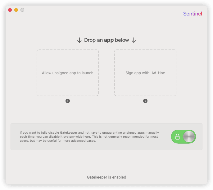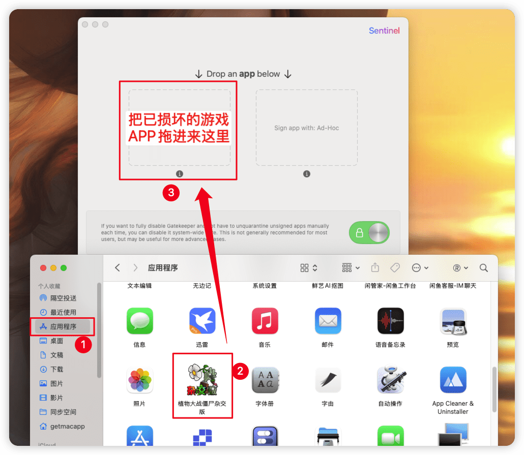 4.打开访达▸ 应用程序 文件夹找到提示已损坏的游戏APP,并把它拖入Sentinel APP界面左侧的框框里面