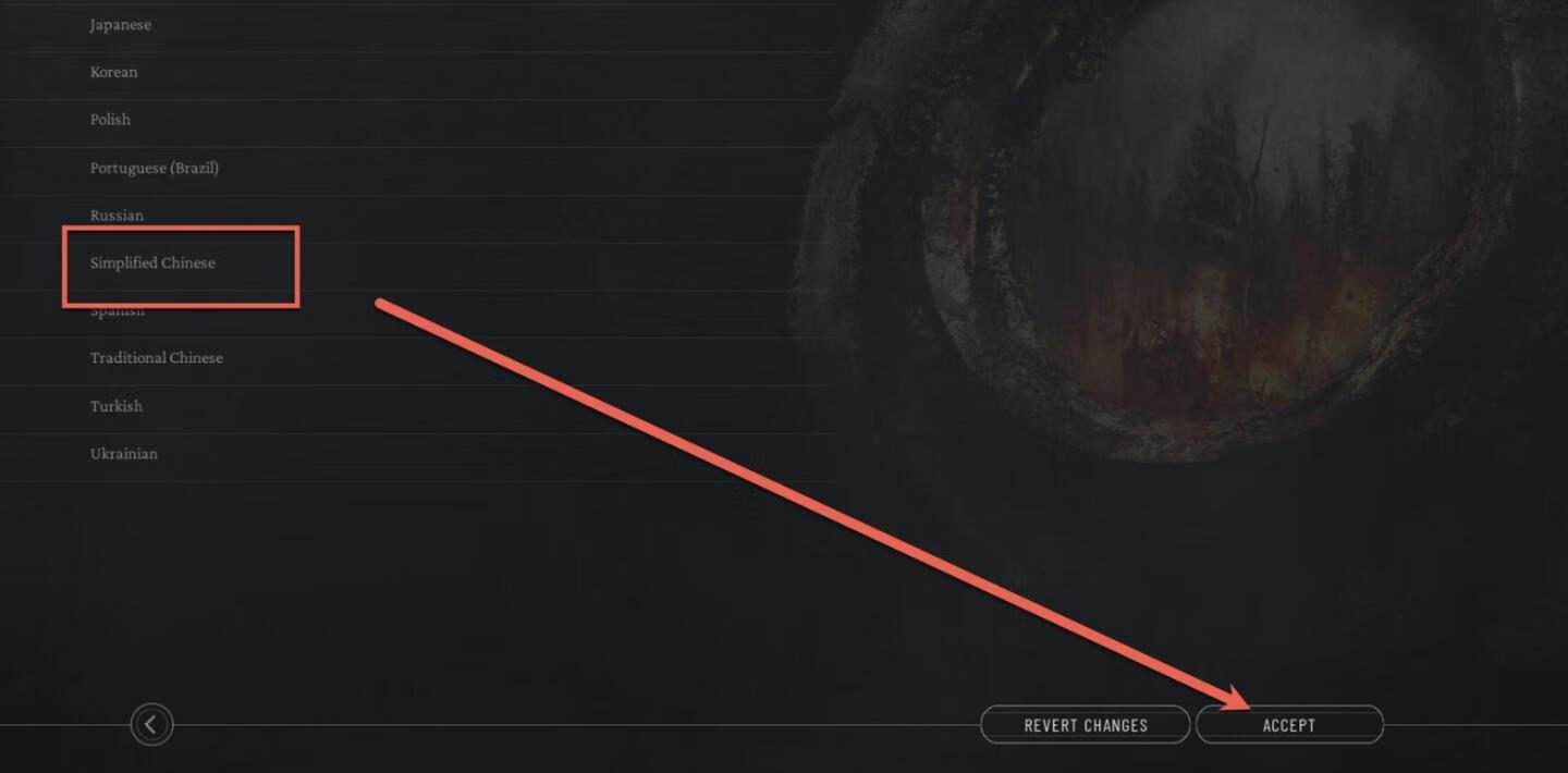 在LANGUAGE中选择Simplified Chinese,点击ACCEPT即可