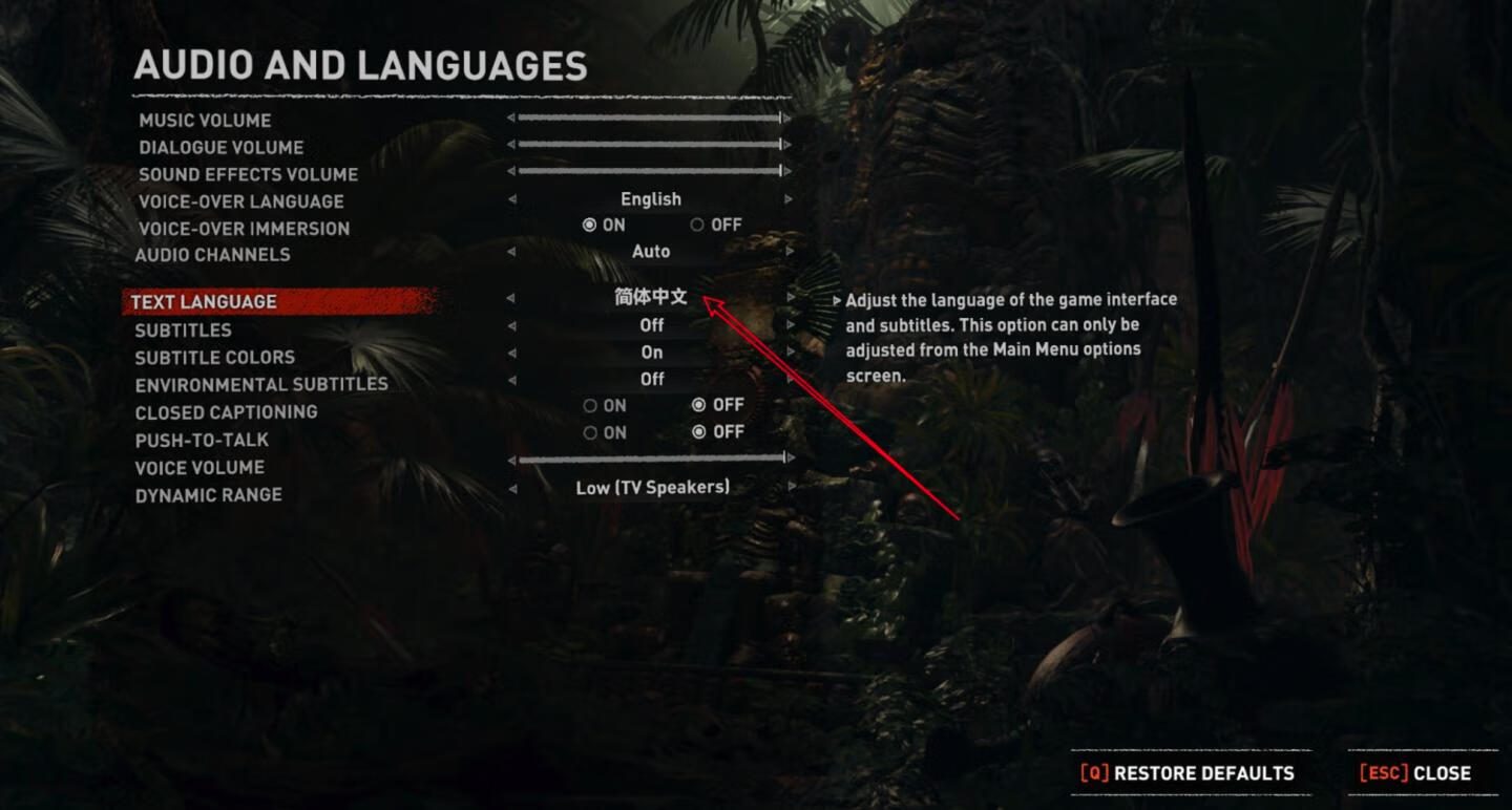 选择TEXT LANGUAGE,切换语言为“简体中文”,按ESC,选择yes 即可
