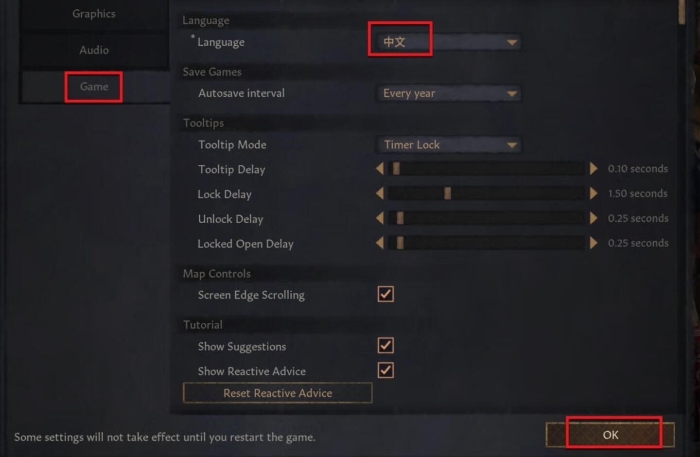 打开游戏,在下方界面上,点击Settings,点击Game,在语言一栏选择中文,点击OK