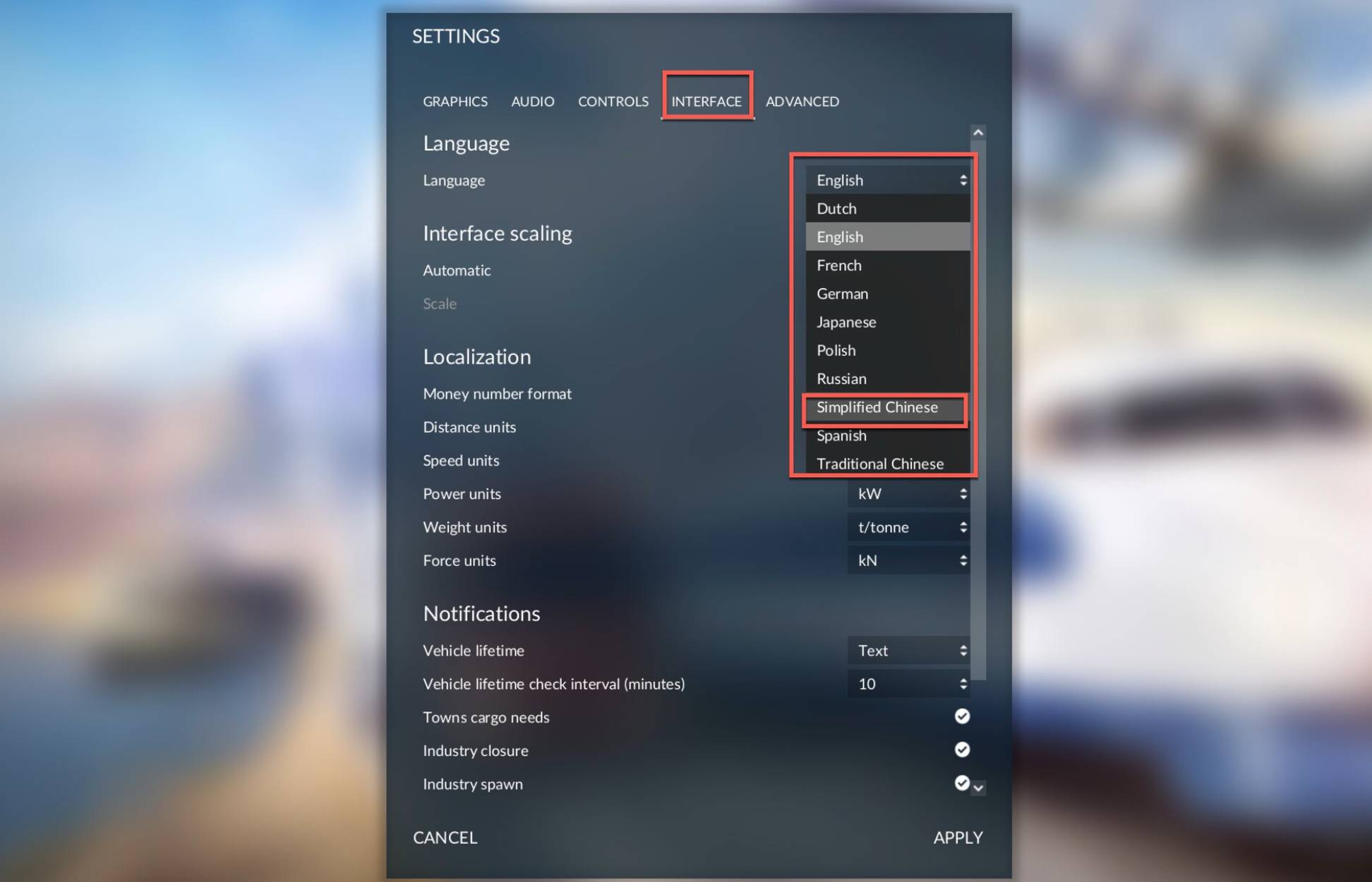 进入主界面后,点击【SETTINGS】,点击【INTERFACE】,在语言界面选择简体中文即可。