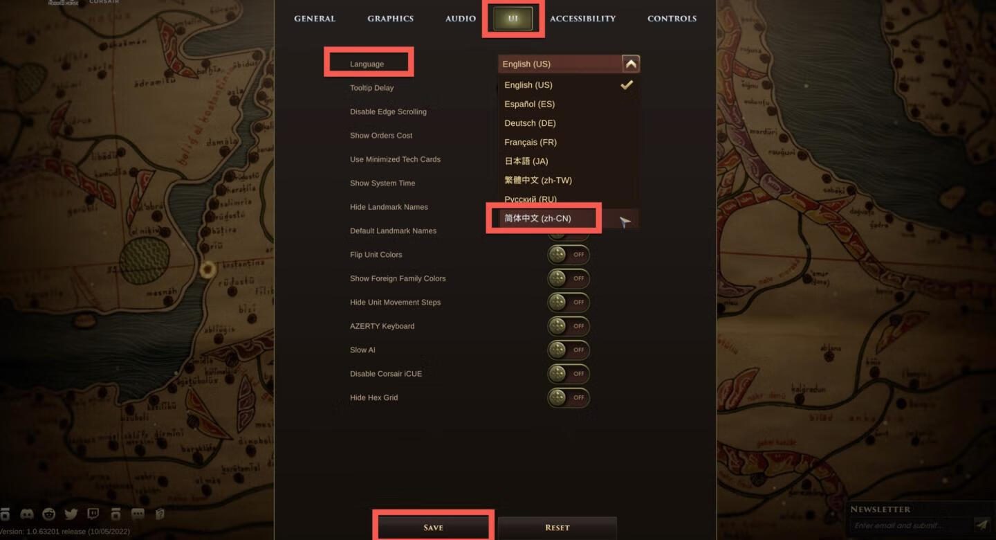 在【UI】中的语言栏找到【简体中文】,点击【save】即可。