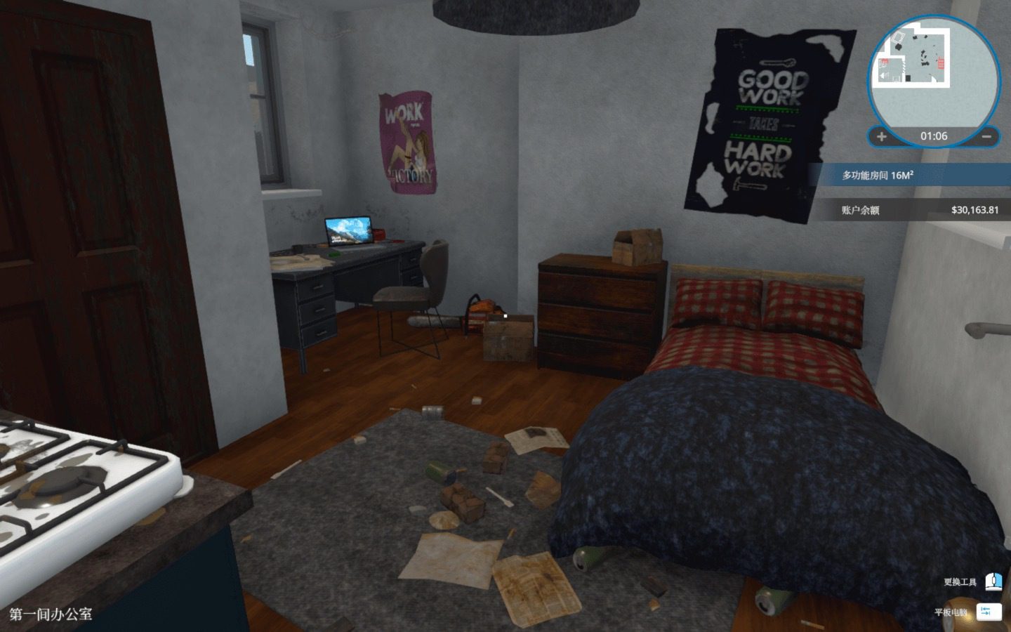 在您购买第一处房产之前,您必须想办法获得一些启动资金。不过不用担心! 幸运的是,有很多工作触手可及!接受附近居民的任务 —— 清洁房屋、粉刷墙壁、安装暖气片、淋浴和空调,甚至为他们的房屋布置家具! 一旦客户为您的辛勤工作付了钱,你就可以购买属于自己的房子了。
