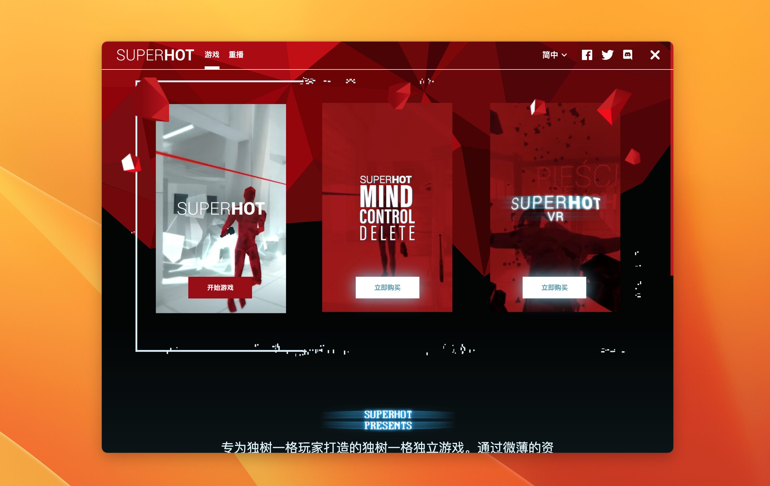 SUPERHOT 独树一帜的画风,为主视角射击游戏增添了崭新、颠覆性的元素。SUPERHOT 精致、简洁的图形言语,有助于你集中心力于要紧之事 – 行云流水般的游戏体验以及影院级唯美的打斗场面。”