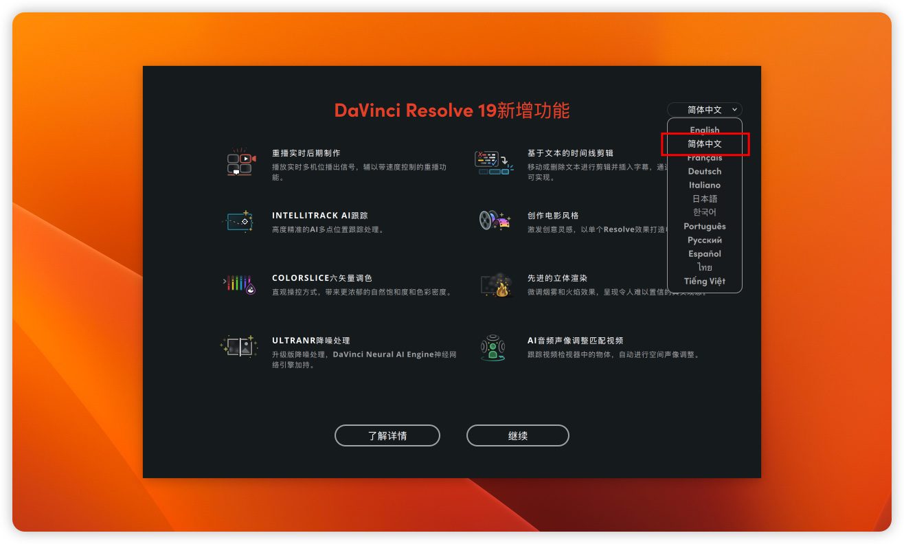 安装完成后,跳过前面的介绍会弹出图片中的界面,右下角点击选择【简体中文】即可。