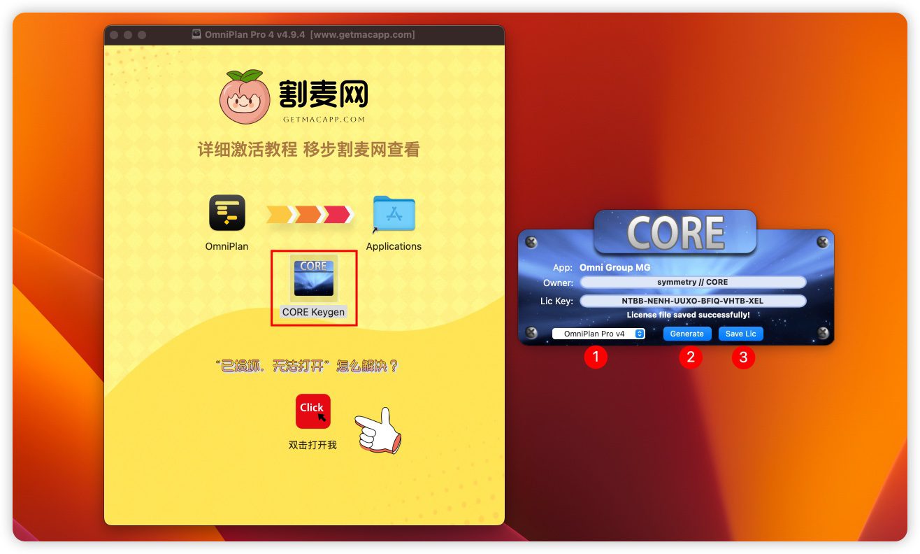 打开OmniPlan注册机,选择OmniPlan Pro v4,单击Generate,单击Save Lic,完成破解