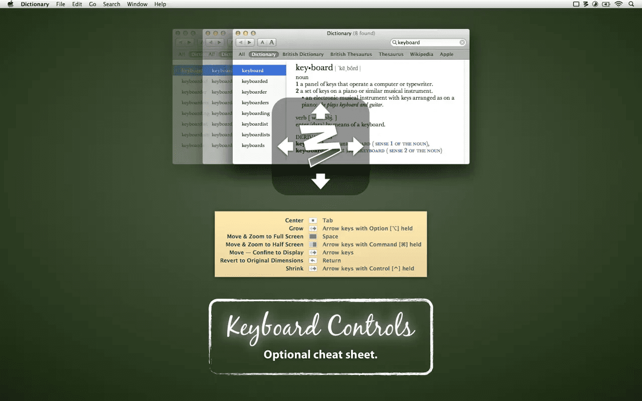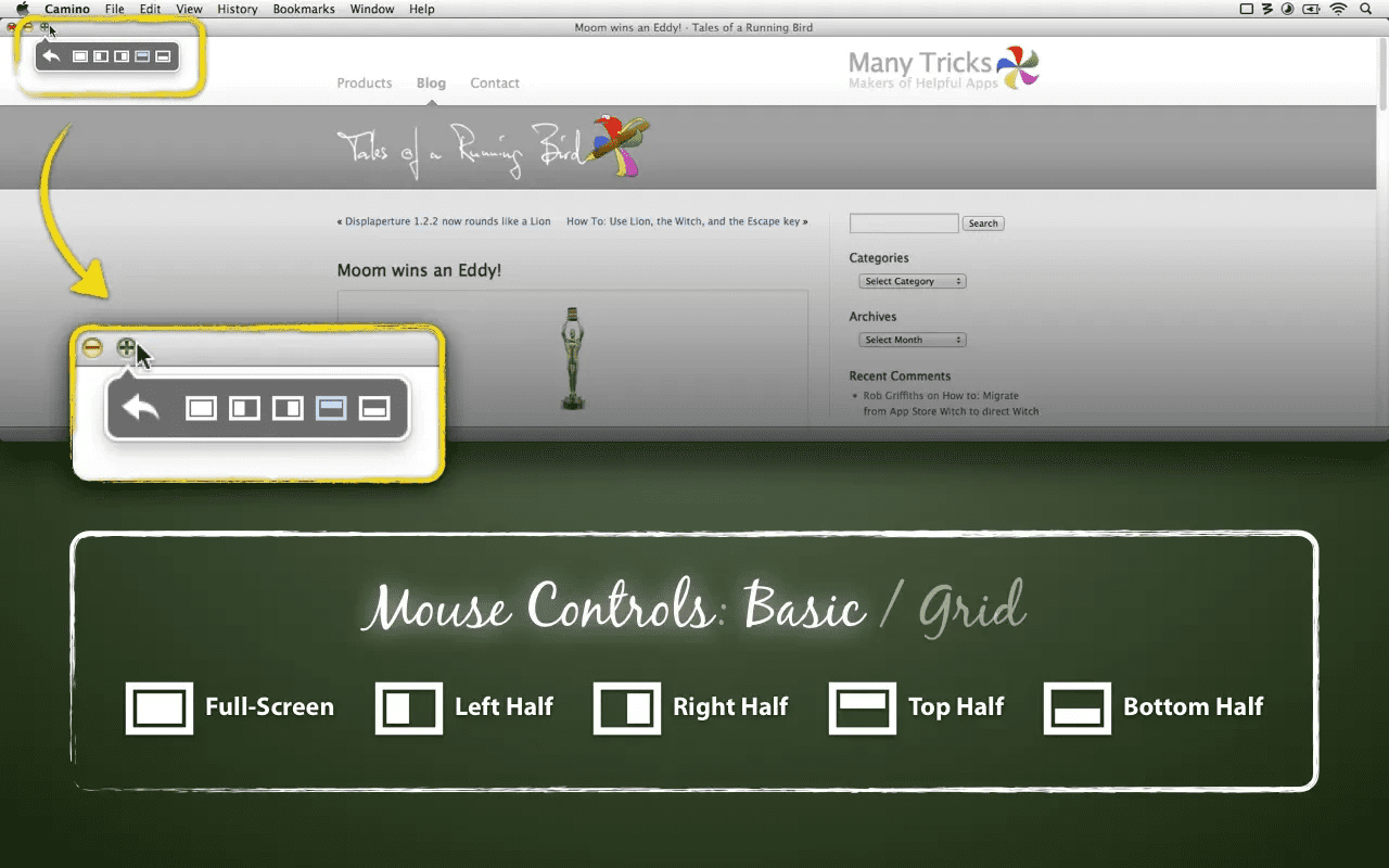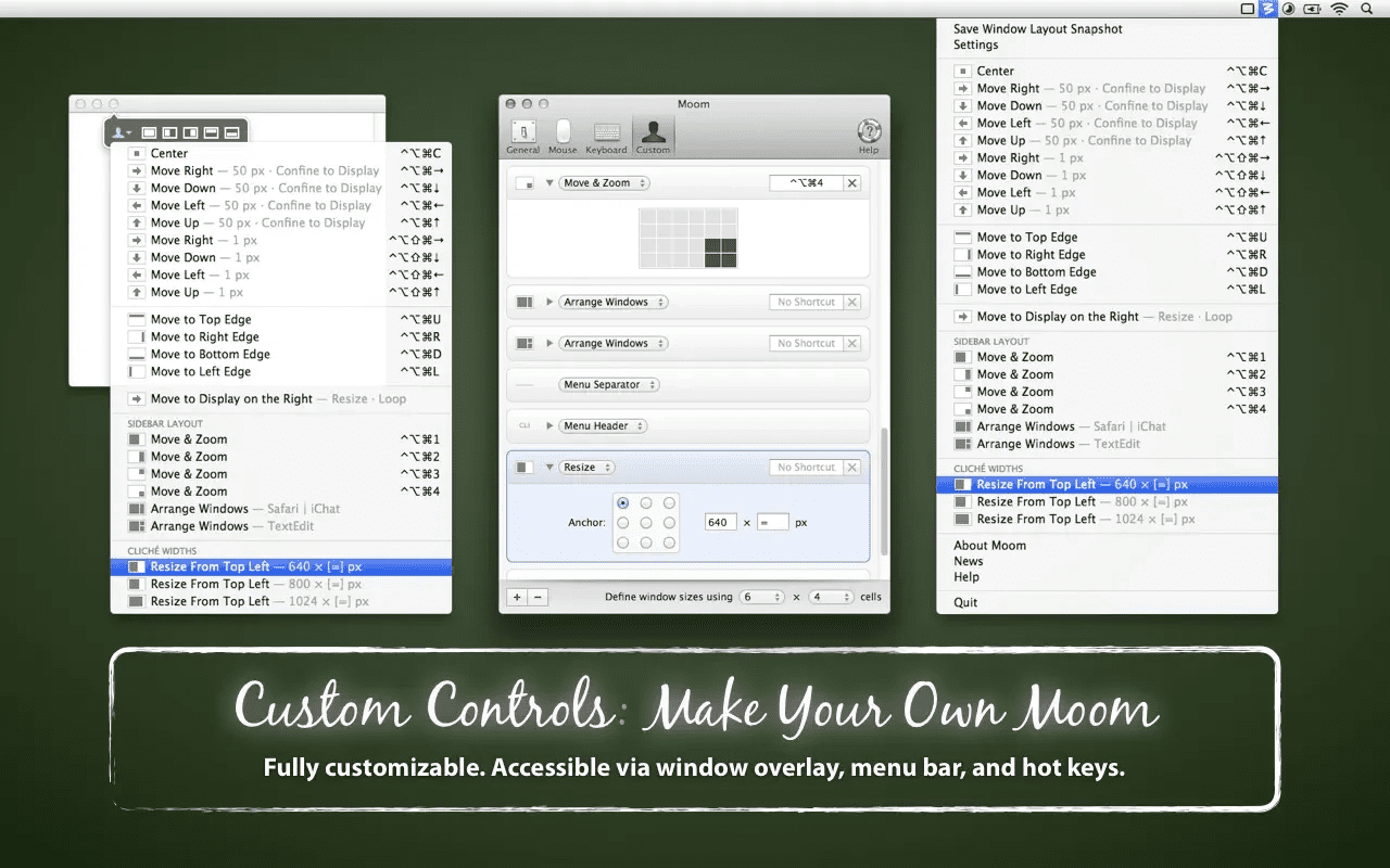 按住 Option键 点击绿色按钮,可调出四角落四分之一屏选项;通过终端命令 defaults write com.manytricks.Moom "触发鼠标网格" -bool YES,可启用键盘快速启动网格调整功能,减少鼠标移动。