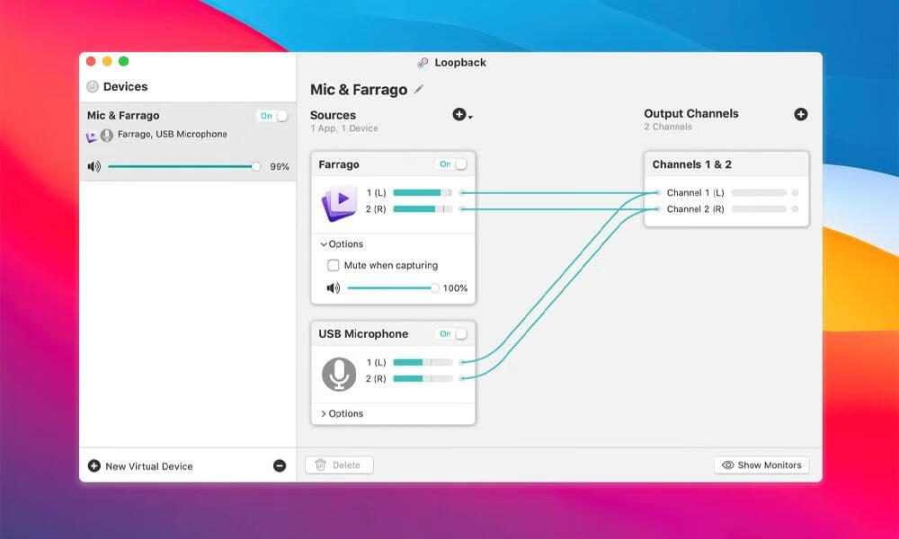 🚨注意事项:建议搭配「Audio Hijack」进行音频录制时,需在Loopback中启用「Monitor via Audio Hijack」选项以避免回声问题。通过这款Mac音频路由工具,您会发现原先需要多台硬件混音器才能实现的功能,现在只需软件内拖拽即可完成✨