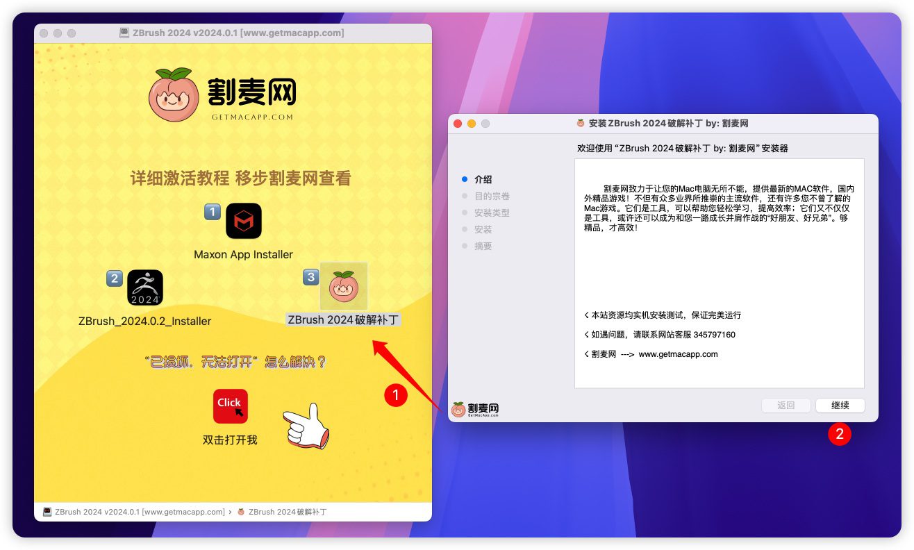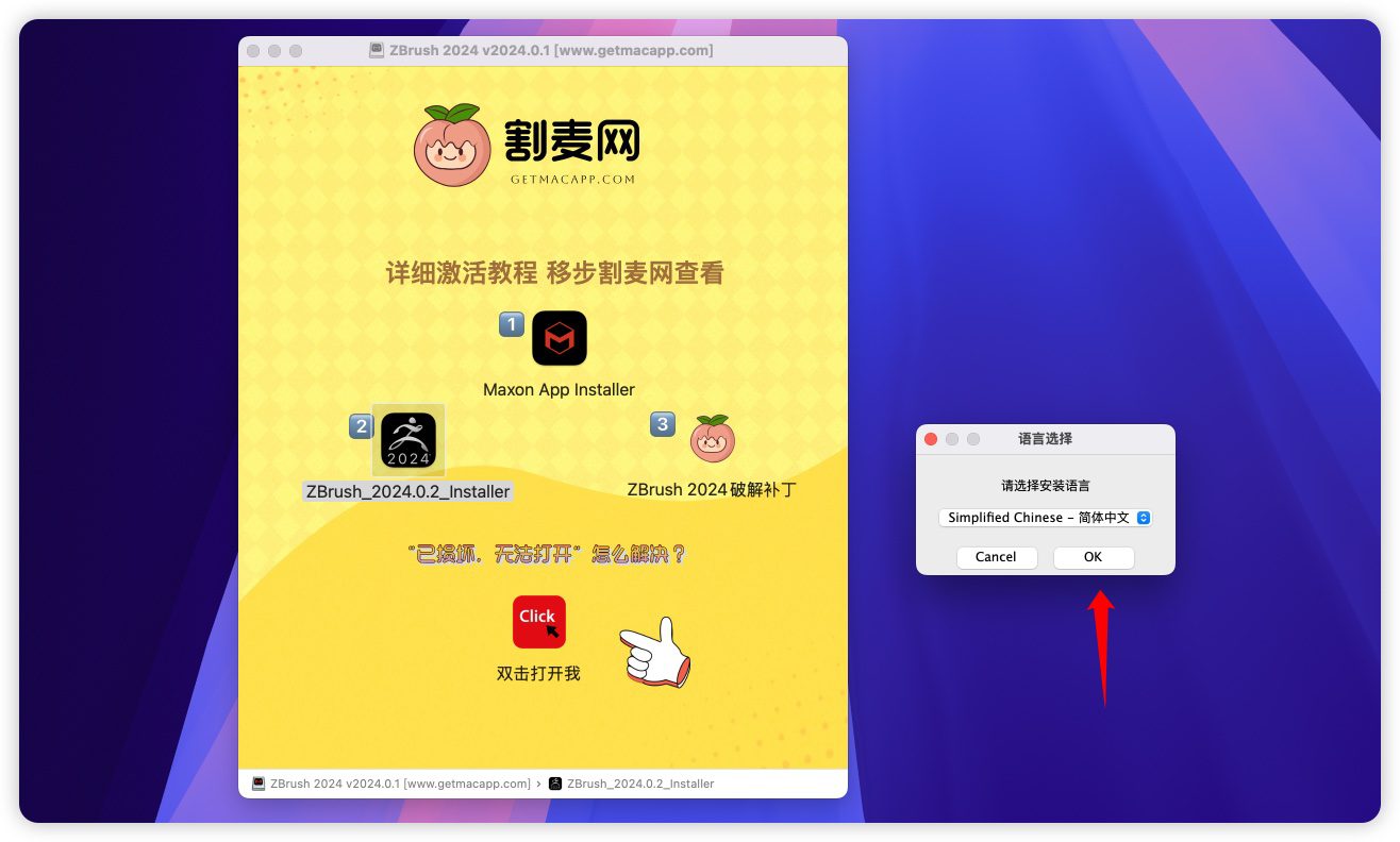3.双击镜像包里的ZBrush_2024_Installer,输入开机密码点击好,根据提示进行安装