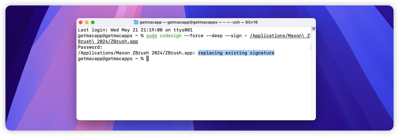 sudo codesign --force --deep --sign - /Applications/Maxon\ ZBrush\ 2024/ZBrush.app
