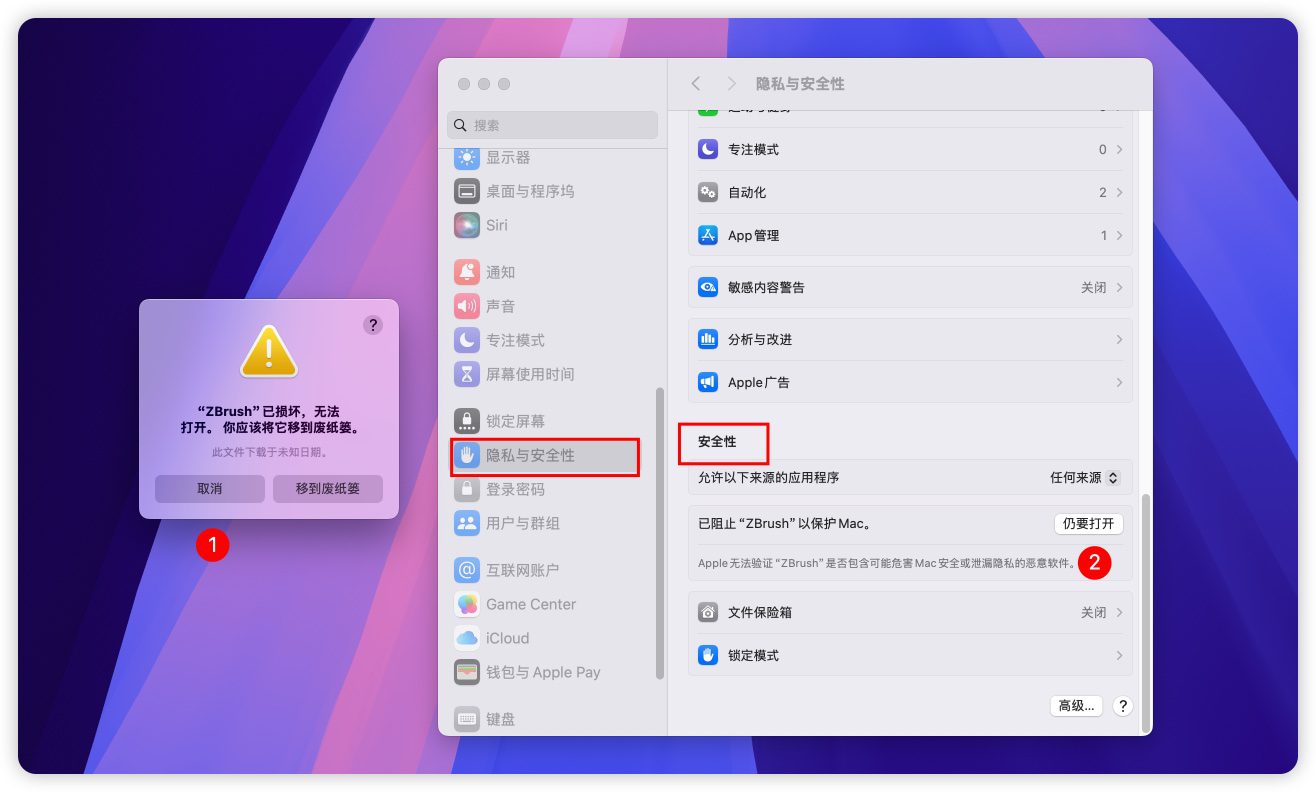 如果提示损坏未能打开,系统偏好设置 ▸ 隐私与安全性 ▸ 安全性下面有个仍要打开,你点一下仍要打开,软件正常打开