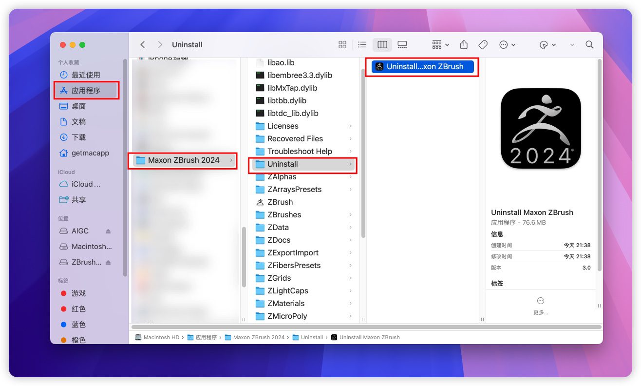 软件自带卸载器。打开这个路径:/Applications/Maxon ZBrush 2024/Uninstall