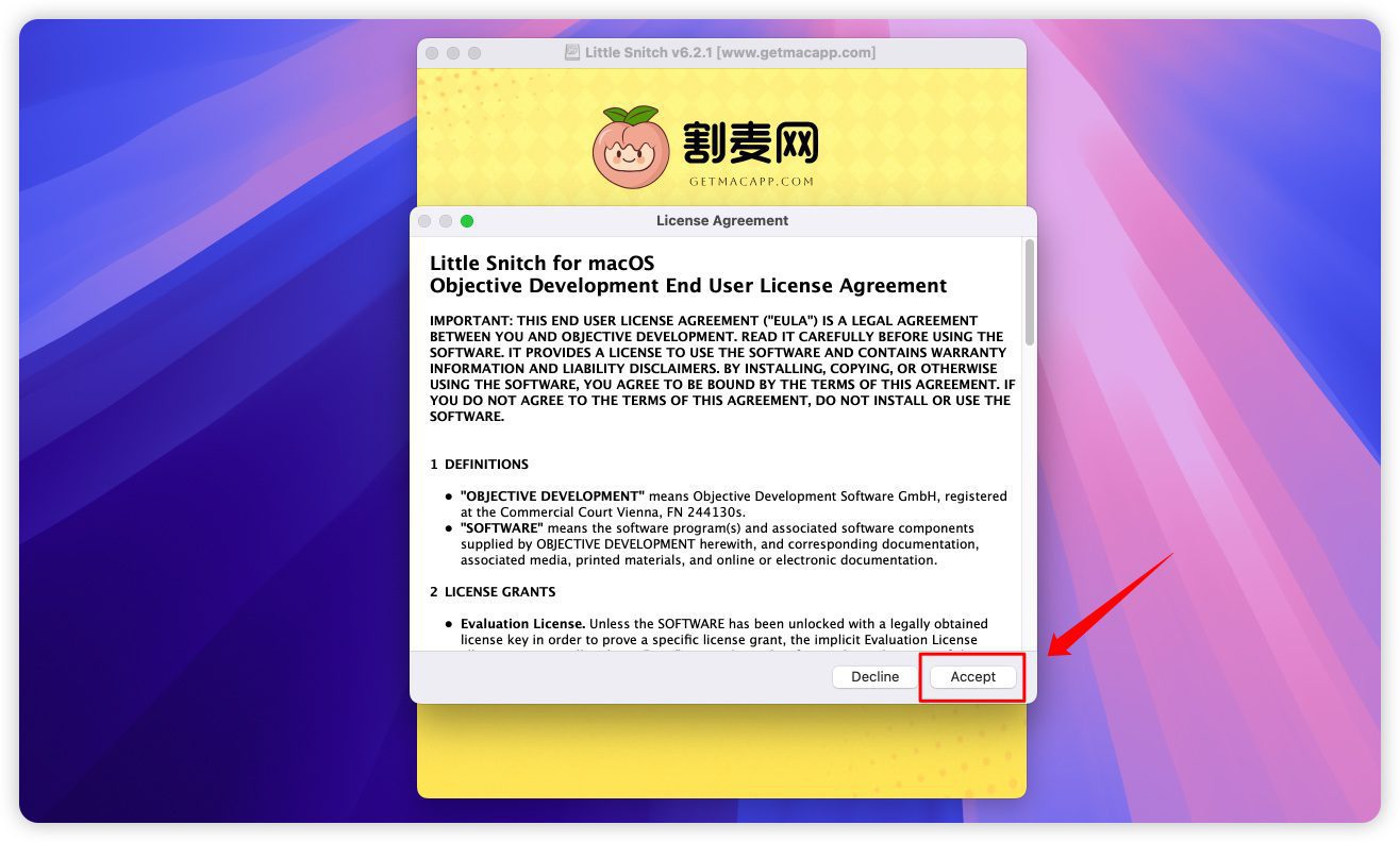 2.去应用程序打开Little Snitch,弹出Little Snitch破解版许可协议,点击Accept,如下图