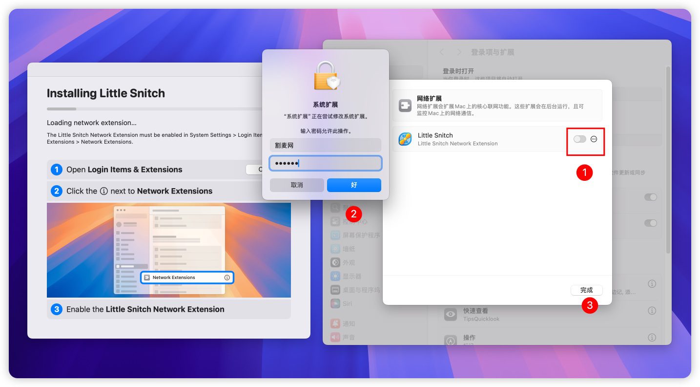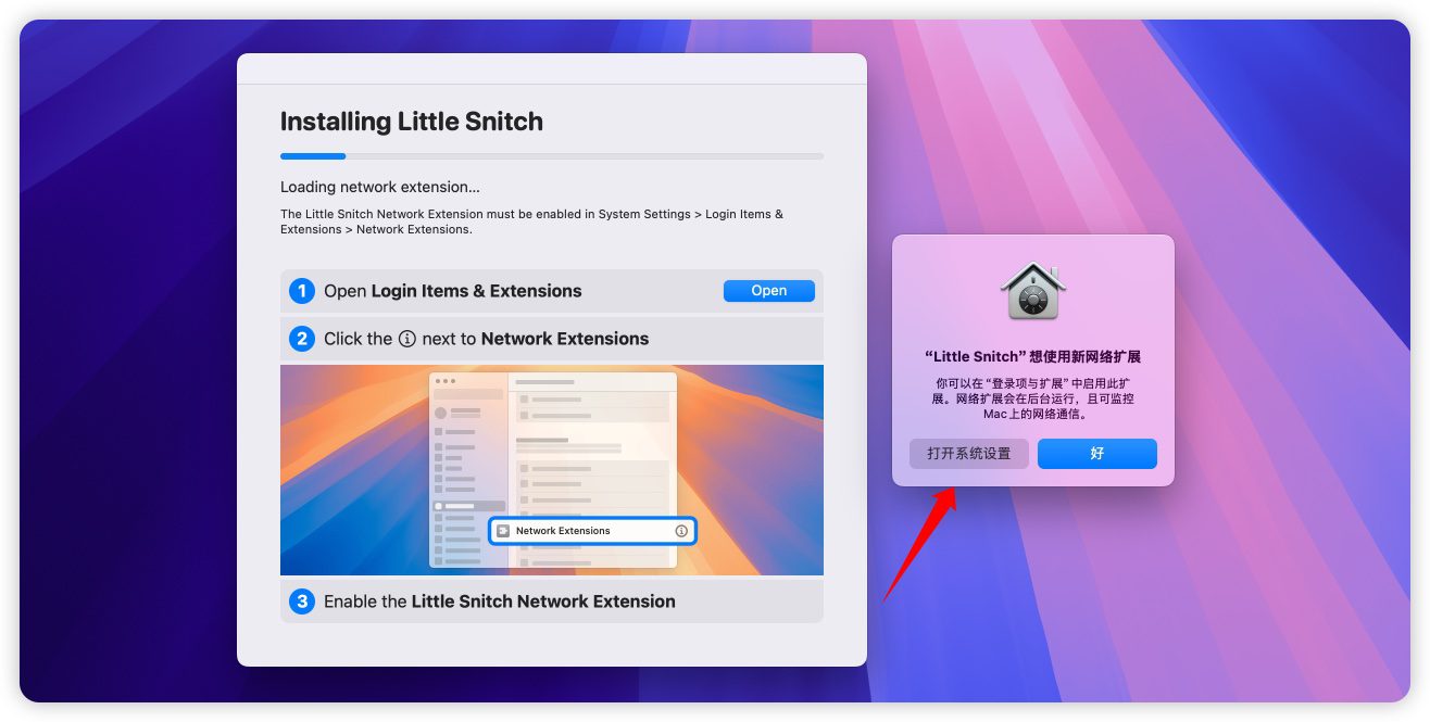 6.在系统设置 -》通用 -》扩展-》网络扩展,点击开启Little Snitch服务