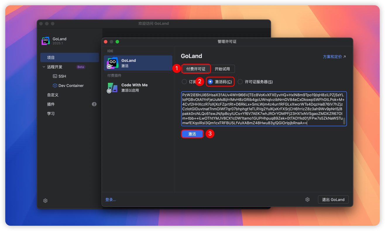 选择付费许可证--激活码,粘贴刚刚复制的密钥,点击激活