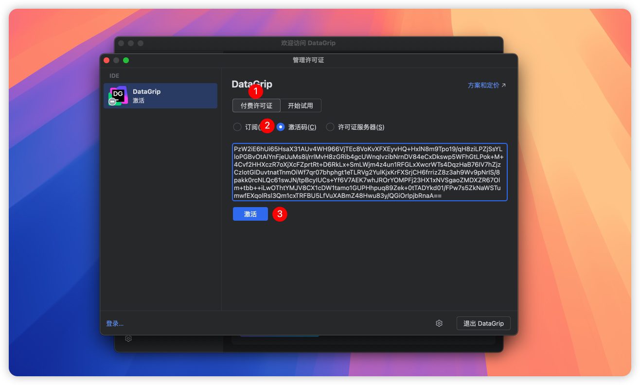 选择付费许可证--激活码,粘贴刚刚复制的密钥,点击激活