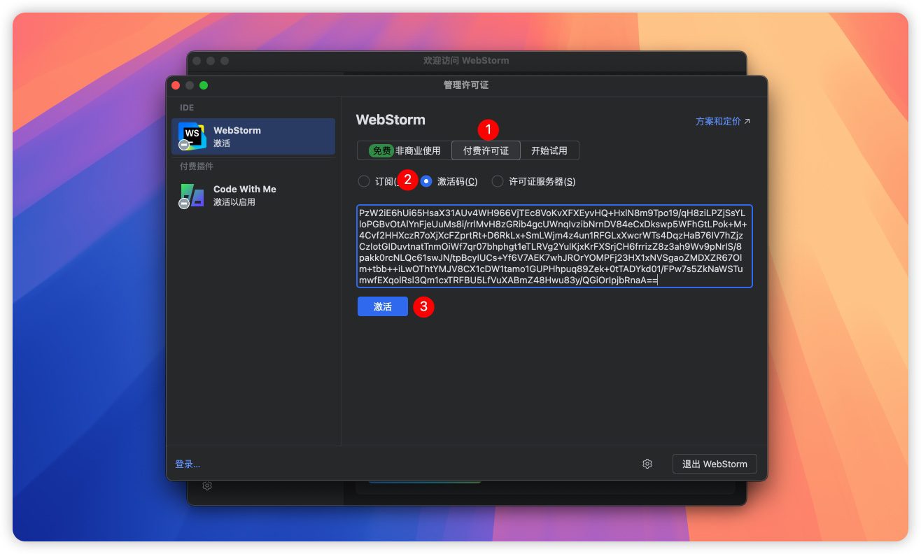选择付费许可证--激活码,粘贴刚刚复制的密钥,点击激活