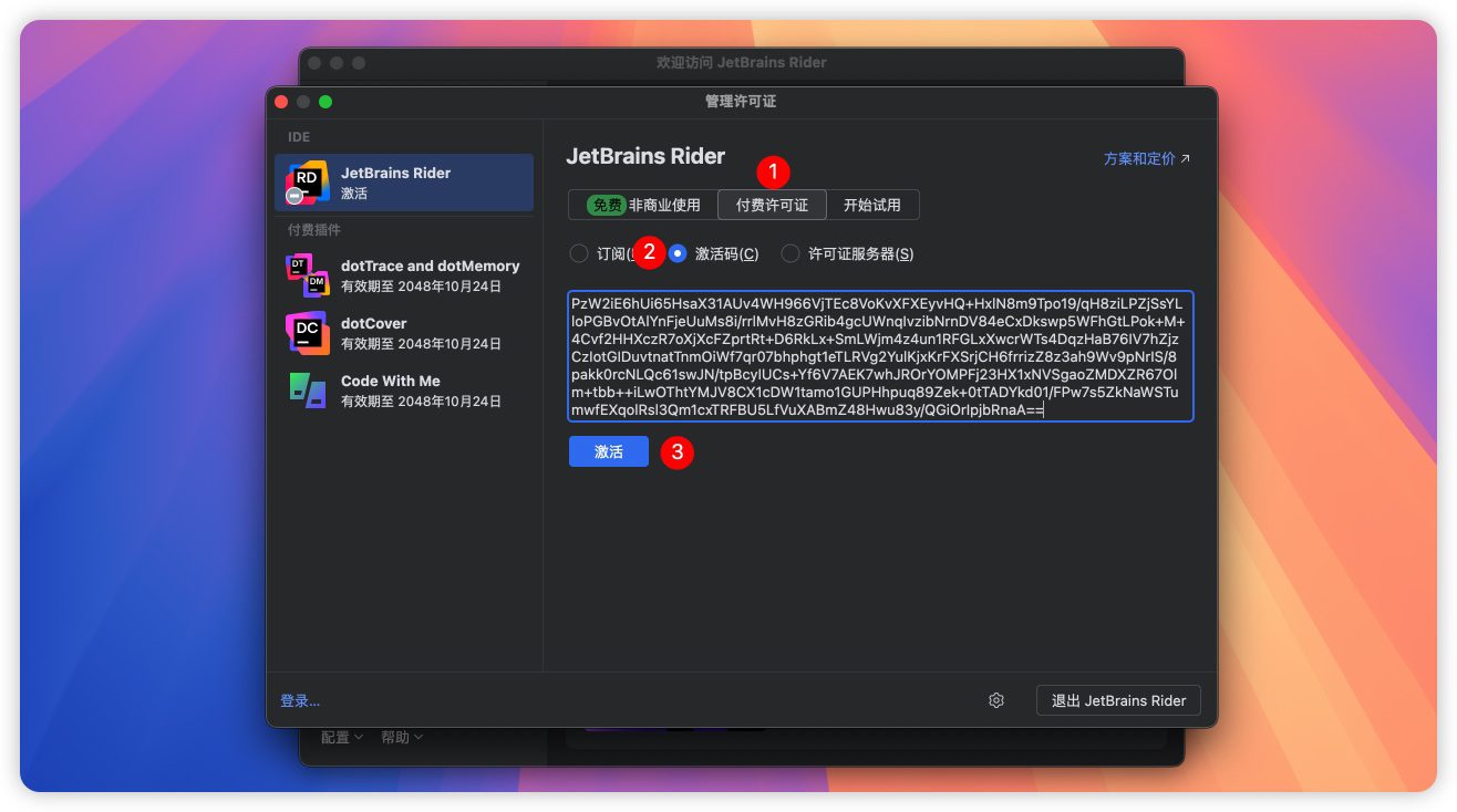 选择付费许可证--激活码,粘贴刚刚复制的密钥,点击激活