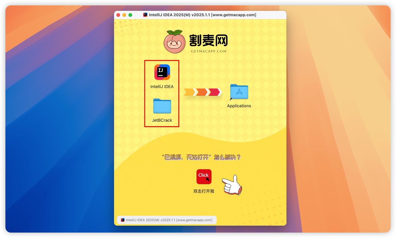 1.打开下载好的软件包,拖动软件和JetBCrack到右边的Applications文件夹中进行安装