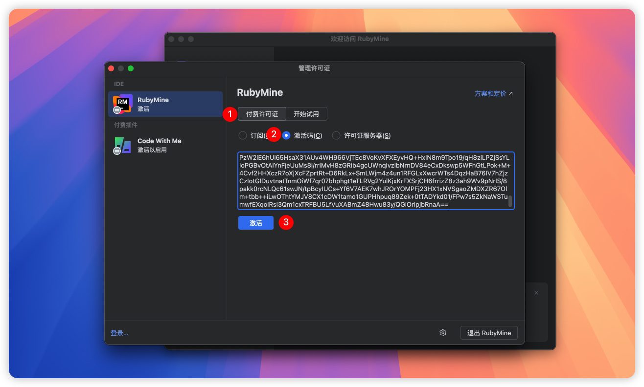 选择付费许可证--激活码,粘贴刚刚复制的密钥,点击激活