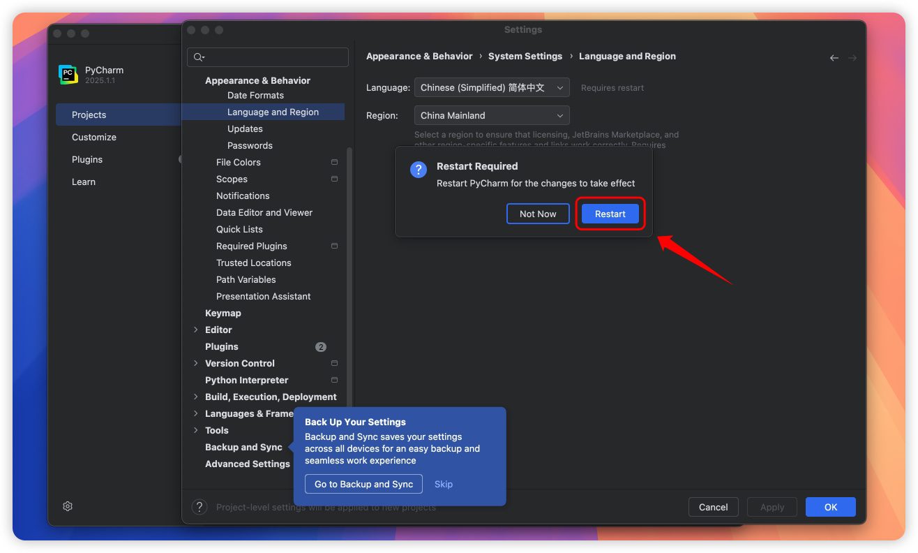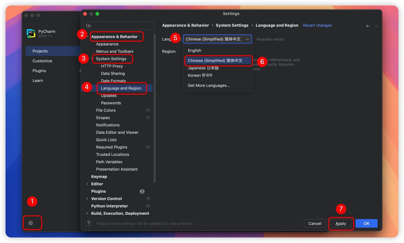 点击齿轮⚙️--Settings--Appearance&Behavior--System Settings--Language and Region--Language选择 简体中文,点击Apply