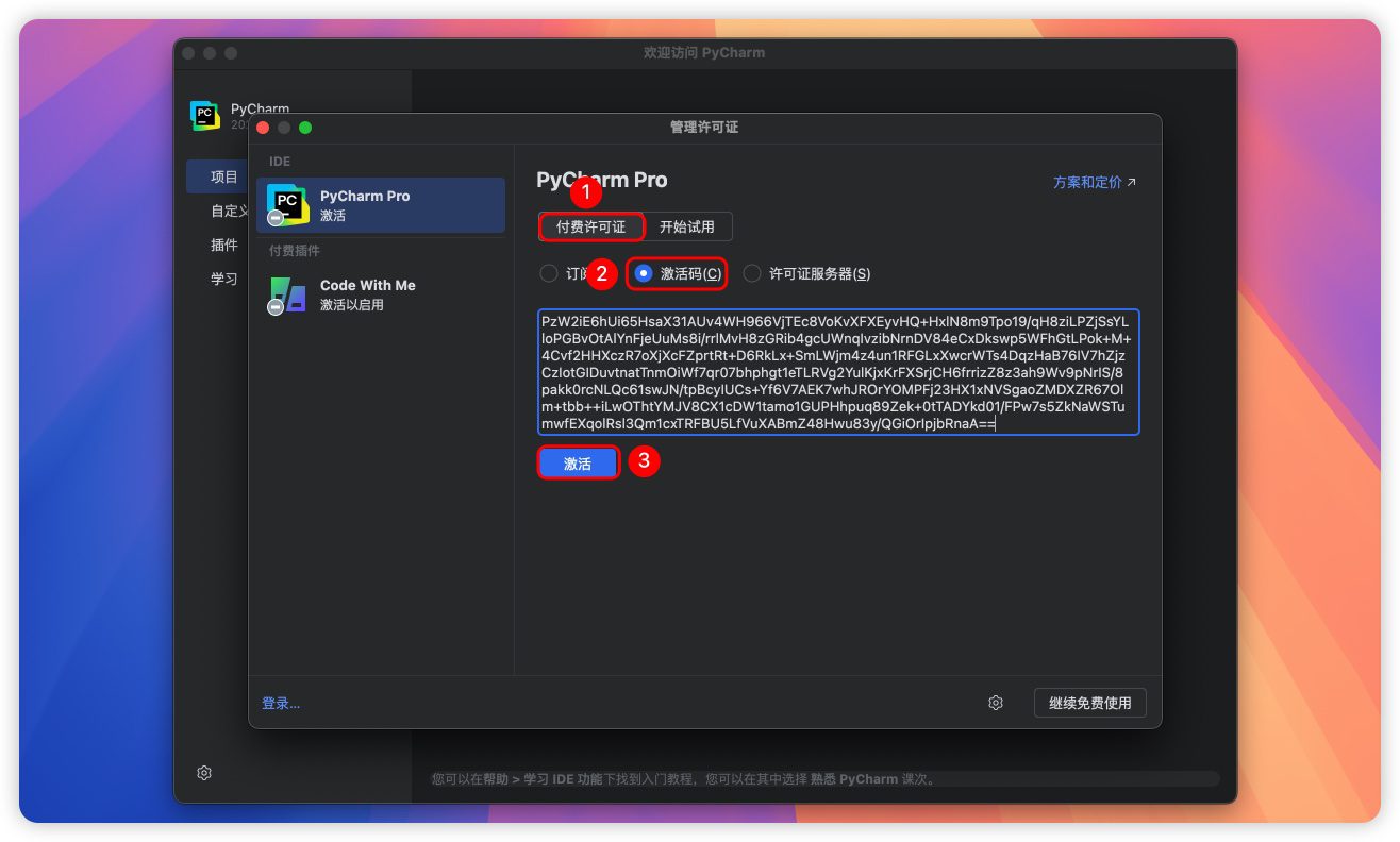 选择付费许可证--激活码,粘贴刚刚复制的密钥,点击激活