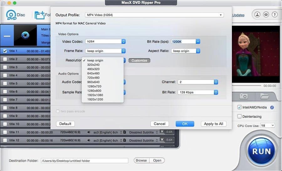 对于高级用户,MacX DVD Ripper Pro 使您可以选择调整解码器/编码器参数以适应特定用途。输出设置可以根据视频编解码器、视频比特率、帧速率、宽高比、分辨率、音频编解码器、音频通道、音频采样率、比特率等进行定制。