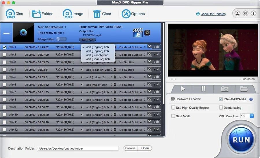 通过重建 DVD 分析算法和标题检查机制,MacX 现在解决了 DVD 备份方面长期存在的问题。它支持任何类型的 DVD(UDF、非 UDF 或 ISO 9660),并以 100% 的成功率完美翻录最近发行的 NTSC 或 PAL 格式的电影和电视剧、具有 99 个标题的 DVD、锻炼版和损坏或无法播放的 DVD。