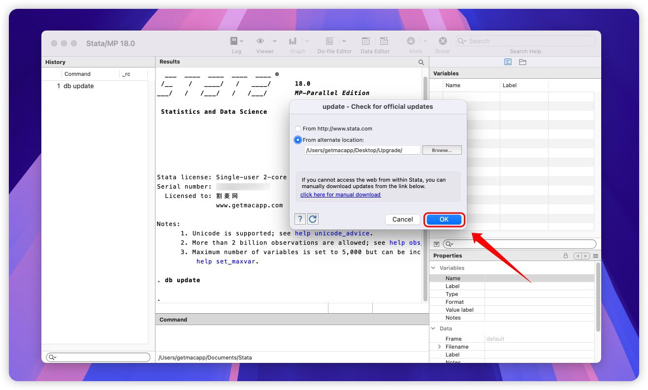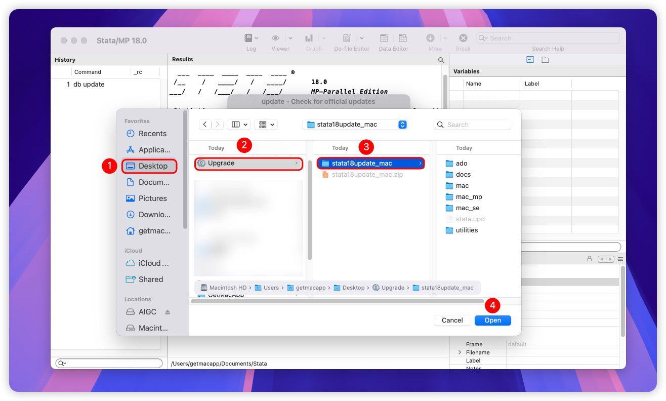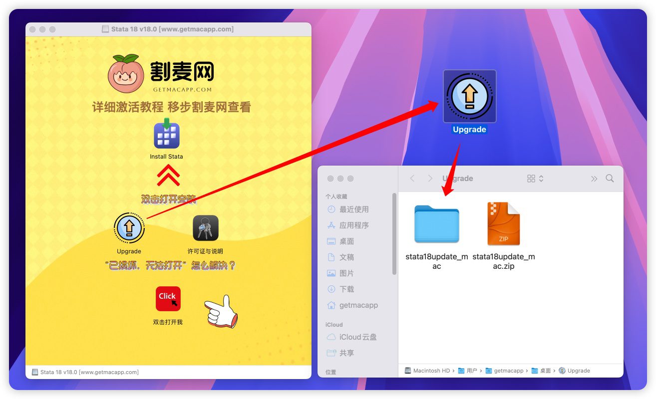 将Upgrade(升级包)拖到桌面,打开Upgrade文件夹,将“stata18update_mac.zip”升级包解压缩得到“stata18update_mac”文件夹(不要放在中文目录下)