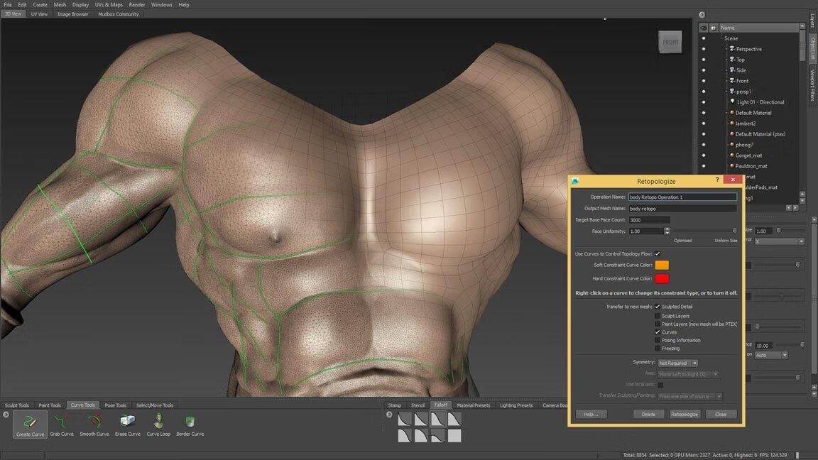 游戏角色开发:在Mac Studio上同步雕刻4K贴图与高模拓扑,通过 自动重拓扑 功能一键生成游戏可用低模。