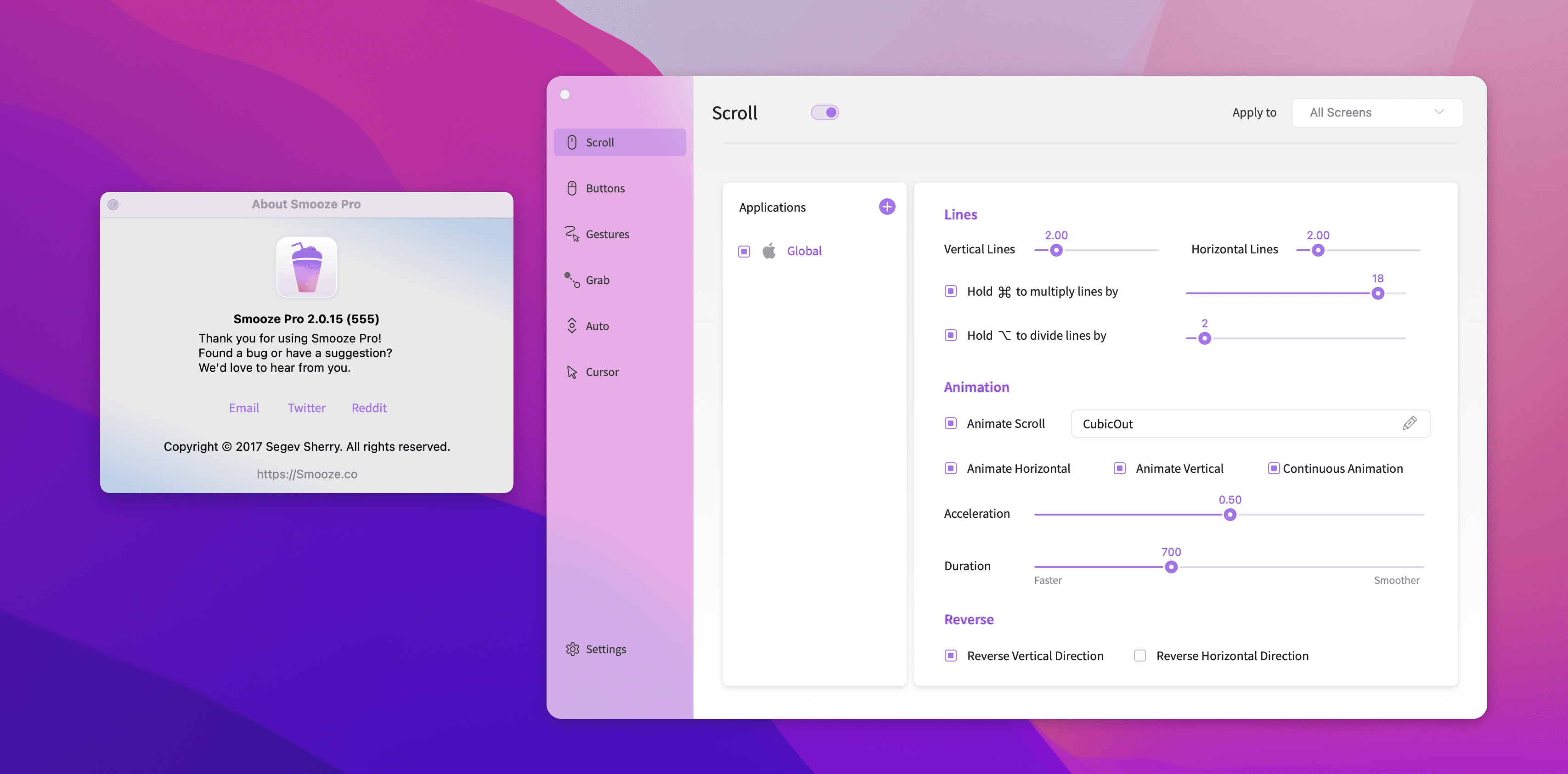 Smooze Pro是一款 鼠标操作革命性增强工具,专为追求「丝滑交互体验」的 macOS 用户设计。其核心价值在于 物理滚轮数字化再造 与 手势维度拓展,通过智能加速度算法、多层级手势库、系统级性能优化三大引擎,将传统鼠标的线性操作升级为「空间交互艺术」。无论是 4K 设计稿的像素级浏览,还是百页文档的精准定位,用户均可通过其 弹性滚动曲线调节 和 3D 手势映射功能,实现指尖到屏幕的零延迟响应,让每一次滑动都成为生产力跃迁的支点。