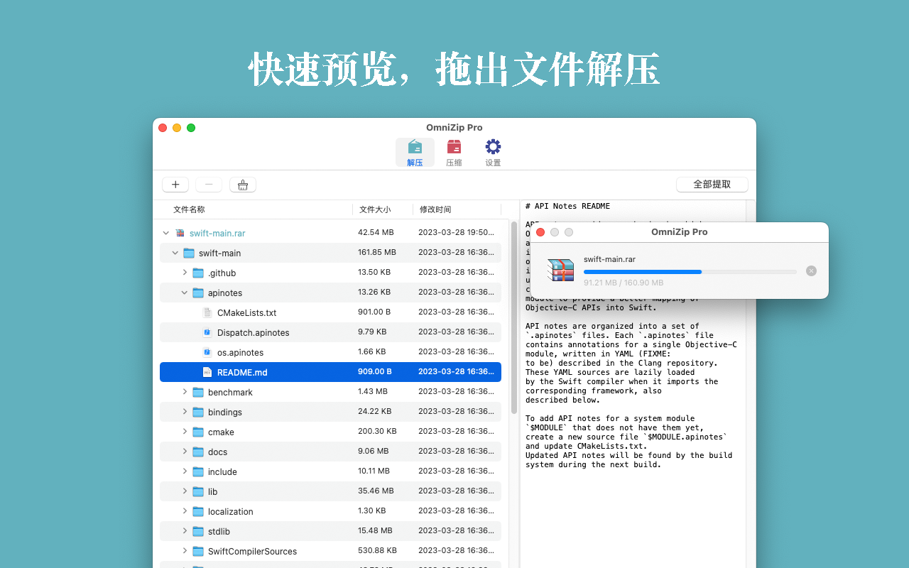💡 小技巧:按住 ⌥Option键 拖拽压缩包到OmniZip图标,可强制跳过损坏文件继续解压!