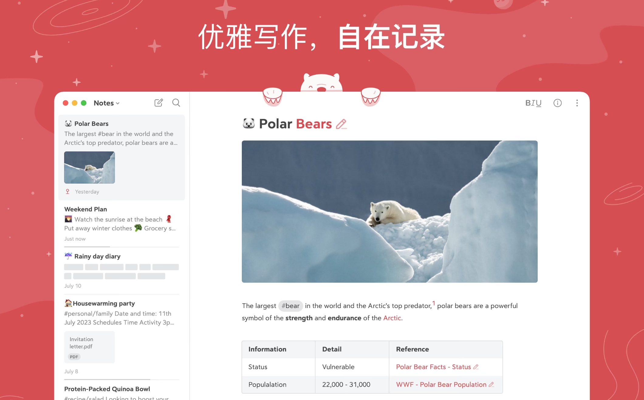 在碎片化信息爆炸的时代,熊掌记 Bear 凭借「零门槛Markdown写作+极简设计」的差异化优势,成为Mac用户高效记录与创作的秘密武器🌟。这款软件无需注册或学习成本,打开即用,却能满足从灵感速记到长篇创作的多元需求。无论是作家、学生还是职场人士,都能用它将思绪转化为井井有条的文字,甚至通过内联任务清单同步管理生活与工作,真正实现「一屏承载无限可能」。