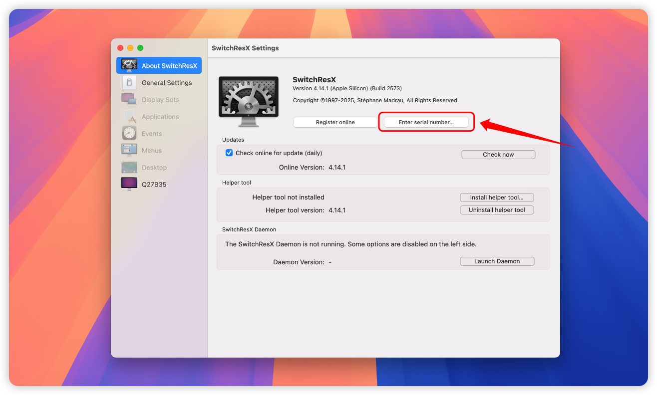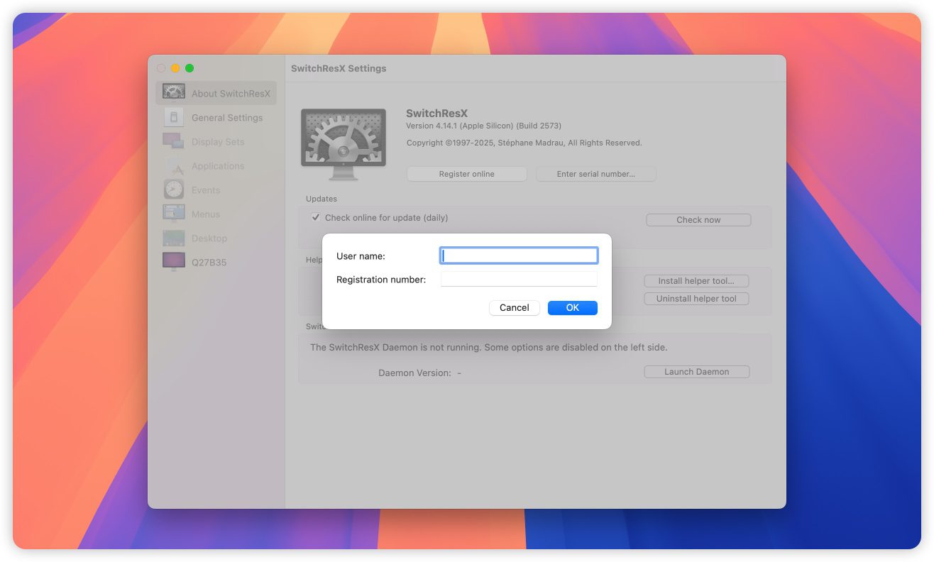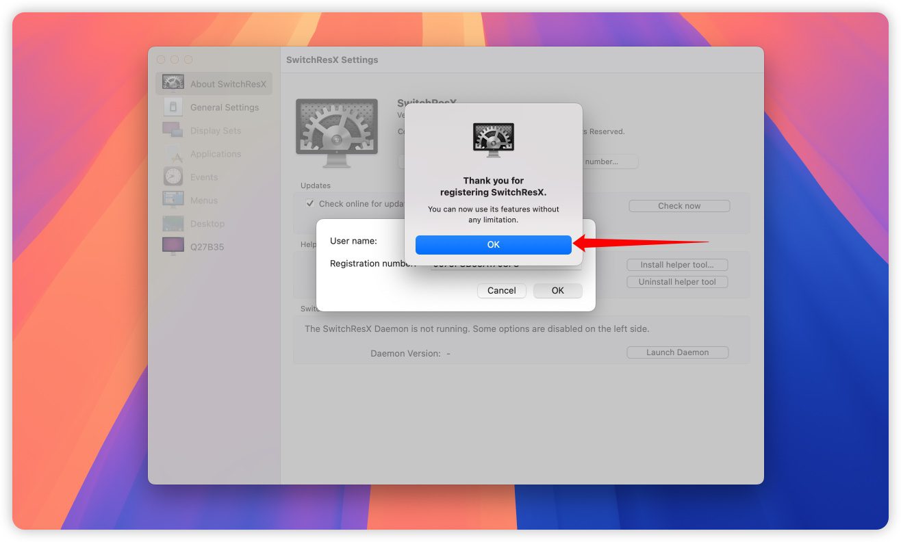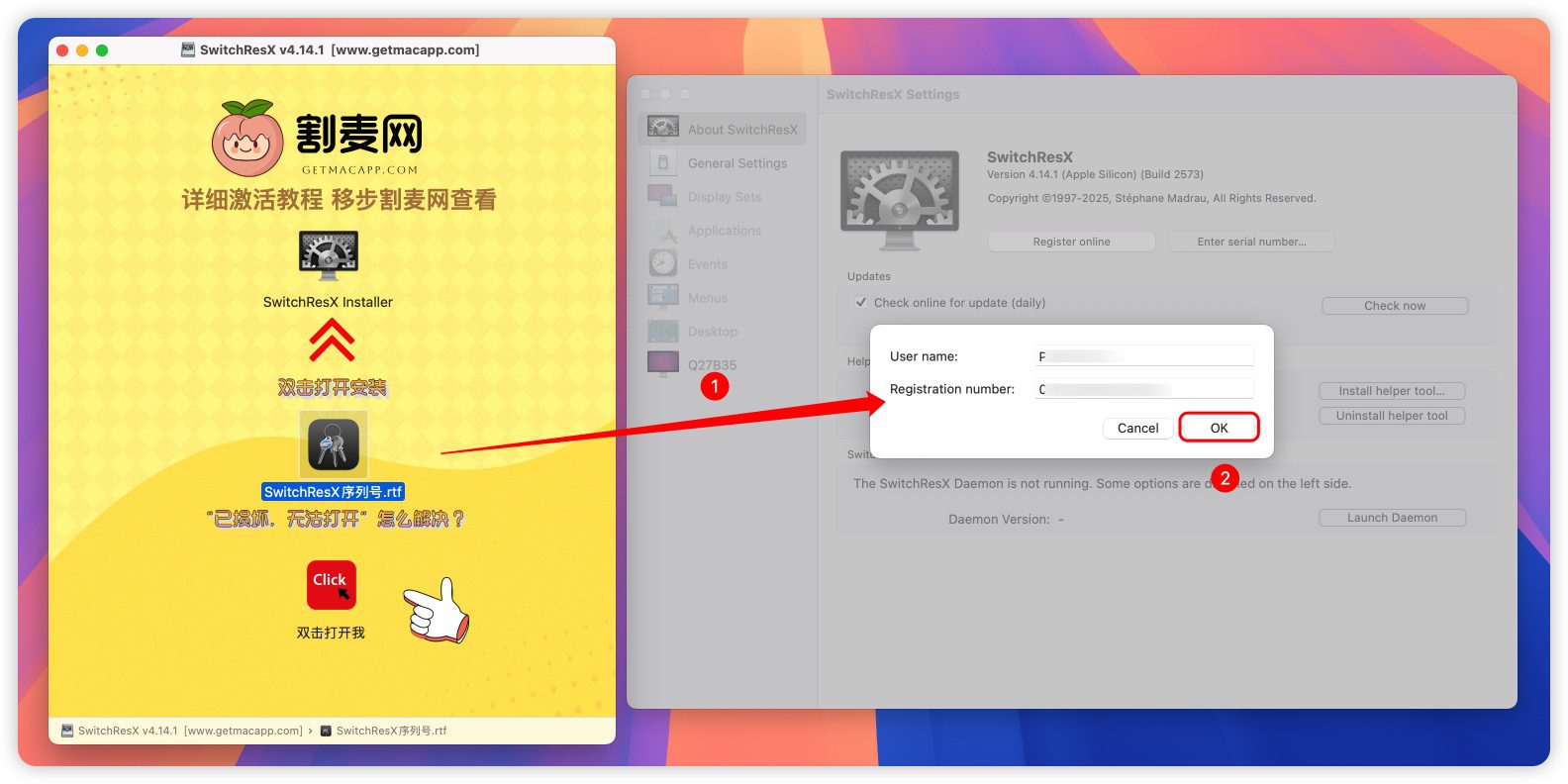5.回到switchresx for Mac激活版安装包,双击打开switchresx 序列号,将switchresx 注册码复制到注册页面,然后点击OK,如下图所示: