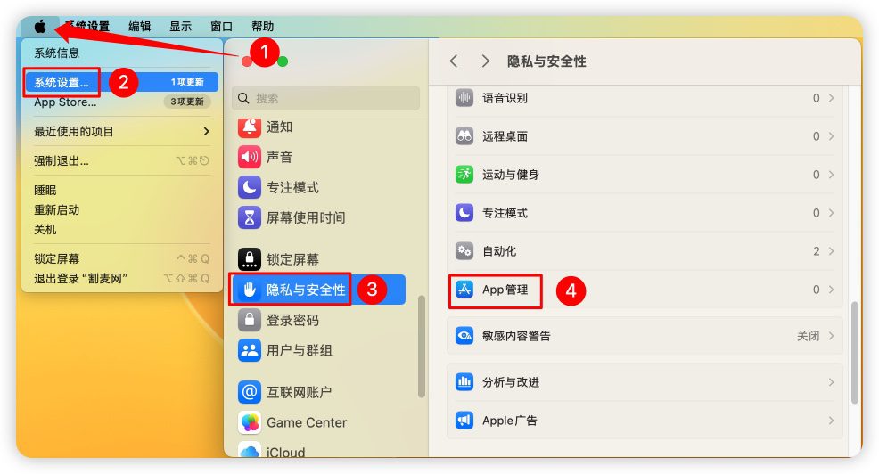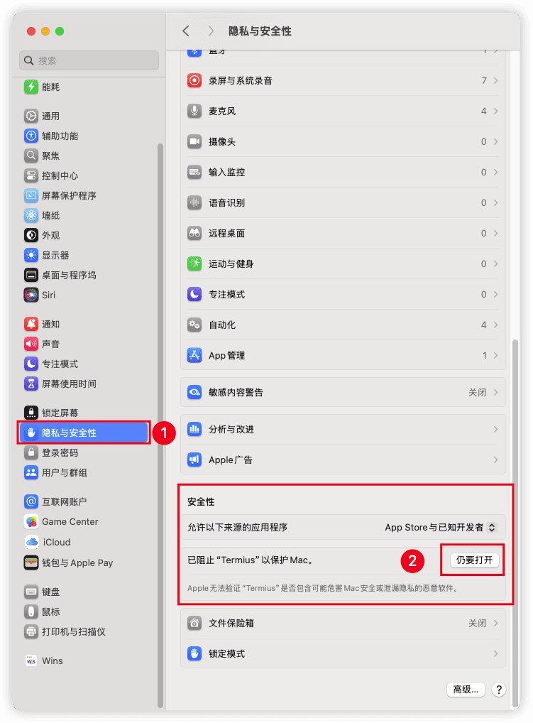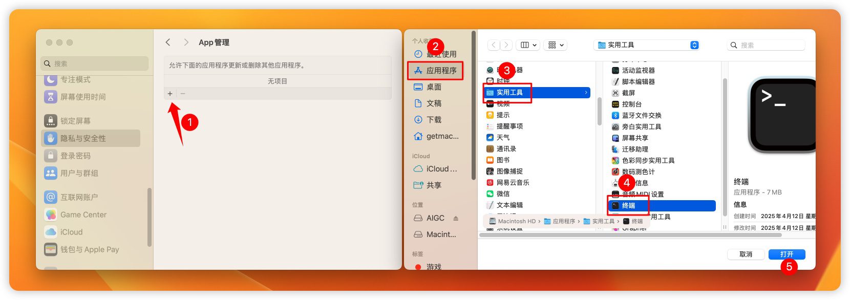 打开 “App管理” 权限.系统偏好设置 ▸ 隐私与安全性 ▸ App管理权限 ☑️勾选了【终端】