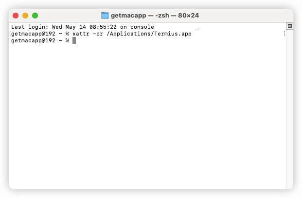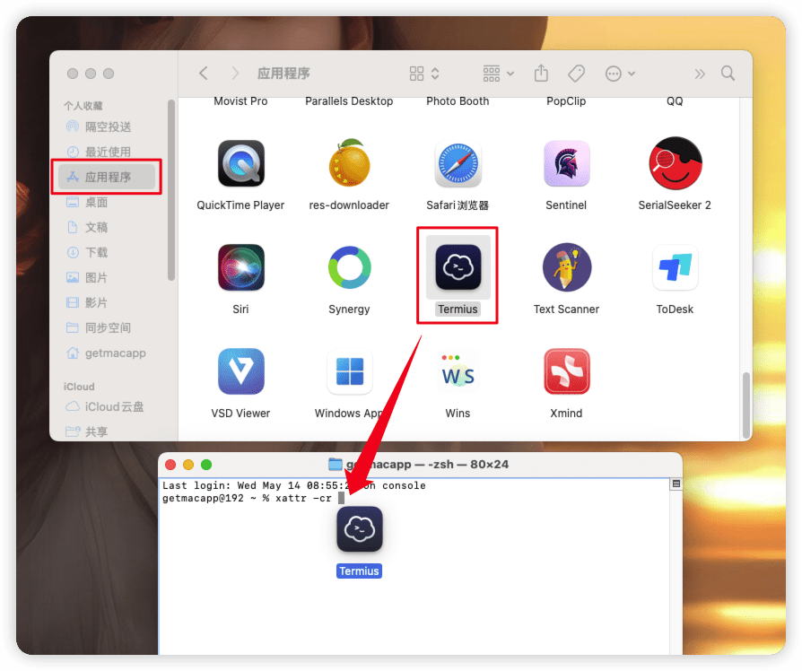 我们这里以Termius为例子,打开访达▸ 应用程序 文件夹找到提示已损坏的APP,并把它拖到终端里面(如下图):