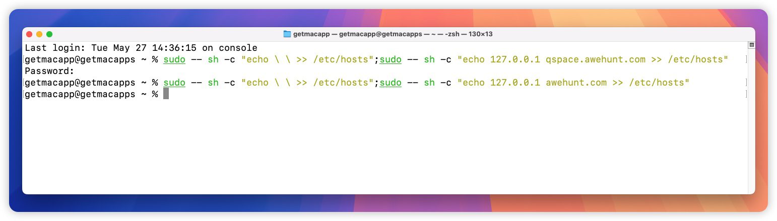 sudo -- sh -c "echo \ \ >> /etc/hosts";sudo -- sh -c "echo 127.0.0.1 qspace.awehunt.com >> /etc/hosts"