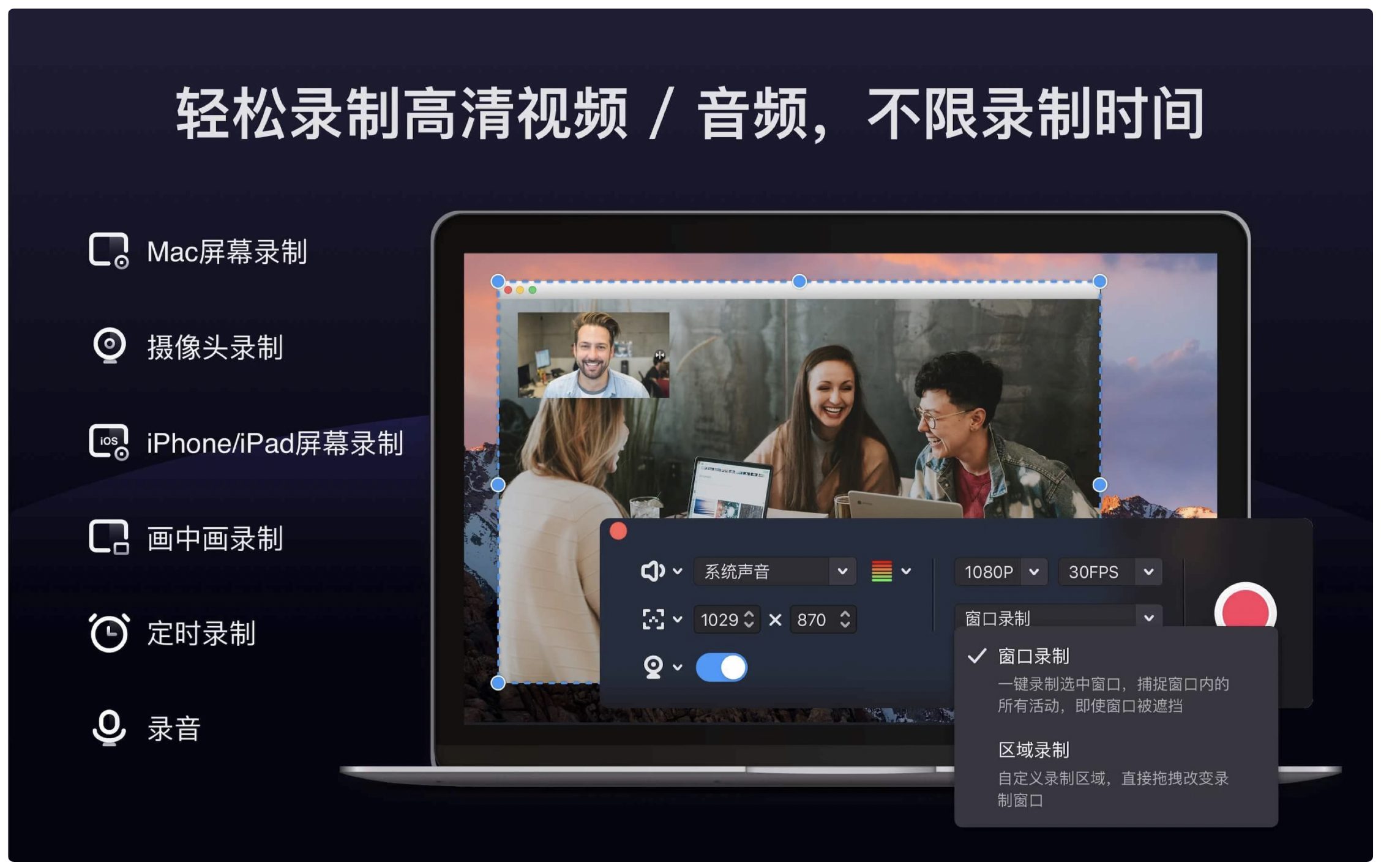 支持Mac全屏/窗口/自定义区域录制,最高4K 60fps画质