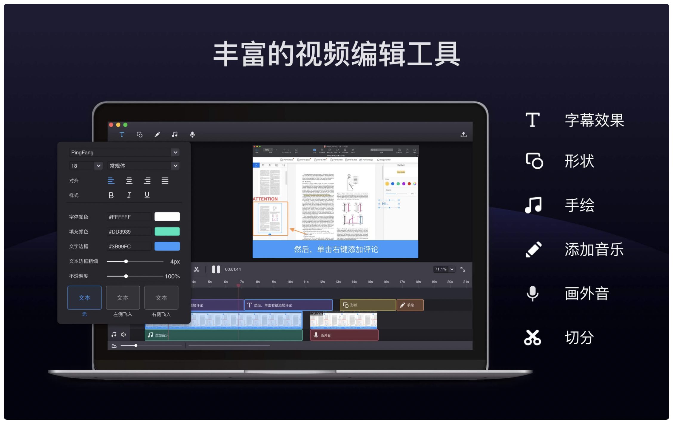 时间轴编辑:动态字幕/手绘标注/背景音乐/画外音录制