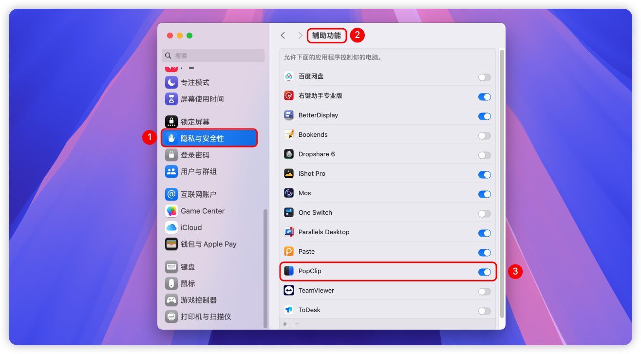 因为macOS系统安全机制原因,需要启用辅助功能中的PopClip,打开辅助功能后,打开PopClip即可使用。