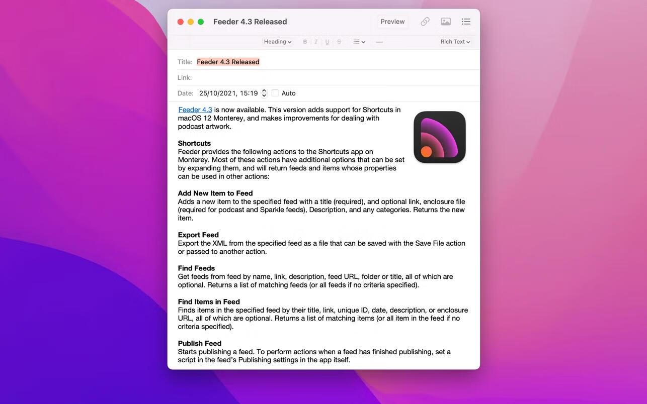 通过专业级RSS编辑工具 Feeder 4,内容团队能构建标准化信息流。其可视化HTML预览功能彻底解决代码调试痛点,而多平台发布能力让您的Mac成为RSS中枢站。对于需要持续输出结构化内容的企业,这款专业级RSS编辑工具将释放30%以上的运营效能。