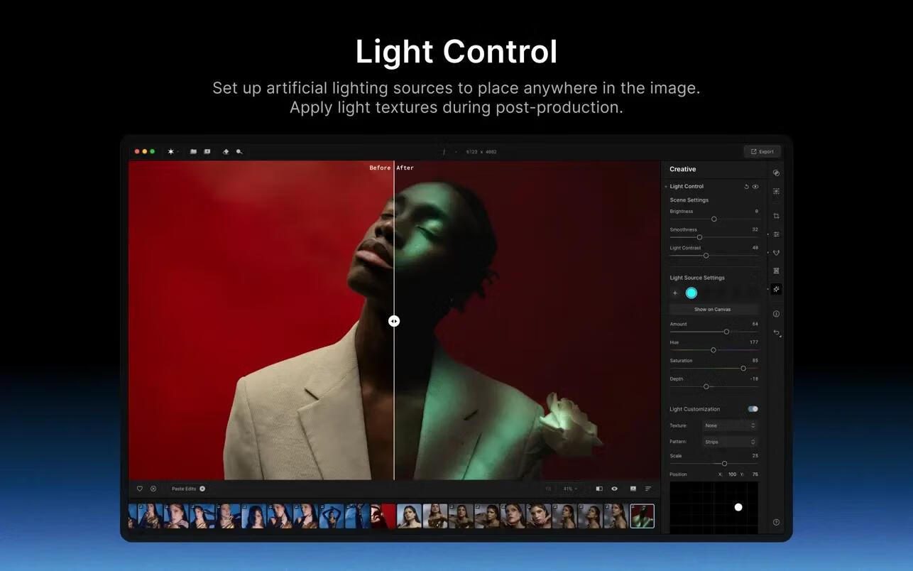 -工作室灯光。这是一个动态工具,允许您自定义人工光源并在后期处理中使用光纹理。