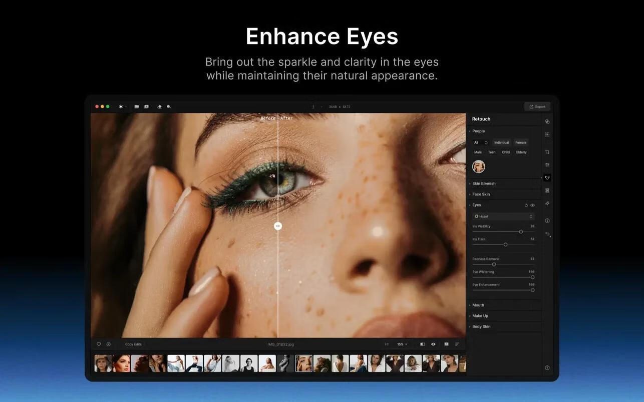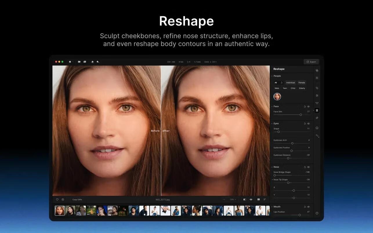 -化妆品。允许您在后期处理中添加腮红、轮廓和高光,以及微调化妆的色调、量和混合以获得自然的外观。