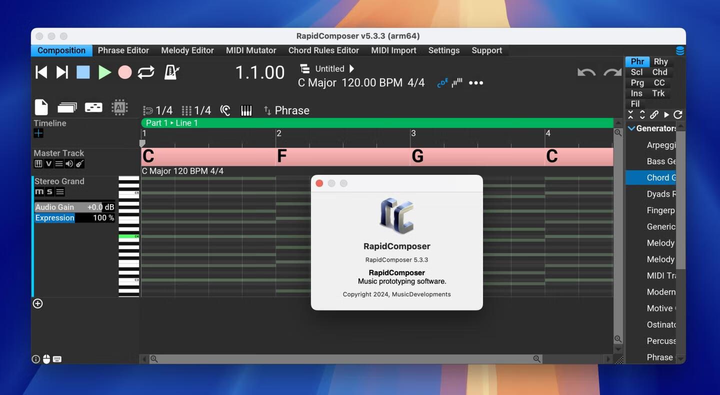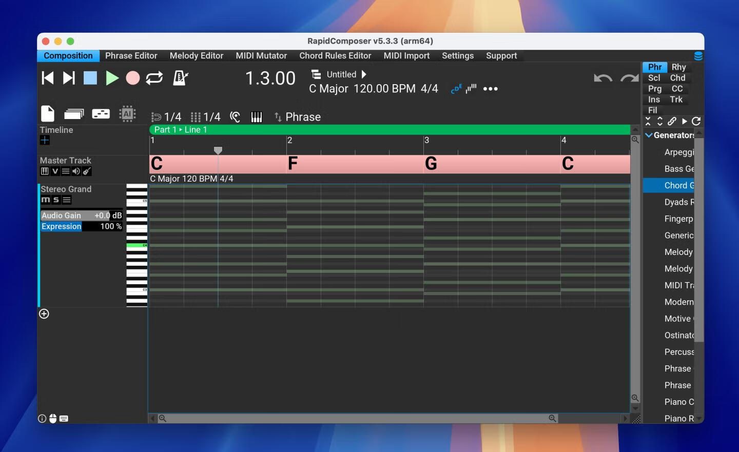 创作动听的和弦进行,使用钢琴风格的乐句(即使您从未接触过钢琴)、自动和声旋律、获取和弦建议、加载带有和弦检测的 MIDI 文件、使用和弦调色板或“五度圈”图表,RapidComposer 将始终帮助您创作歌曲。