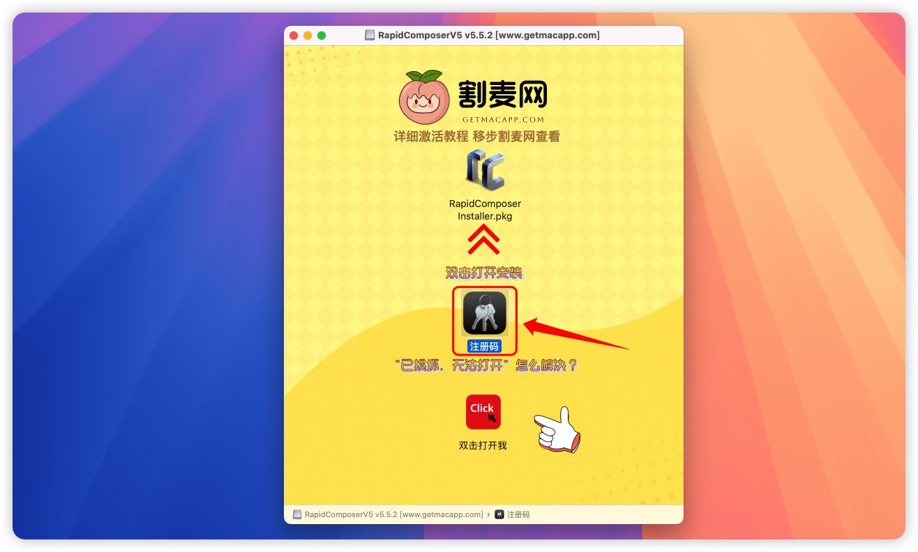 RapidComposerV5破解版下载完成后打开,双击.pkg文件根据安装器提示进行安装