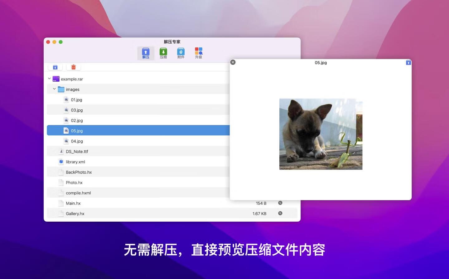 拖拽解压:文件拖至Dock图标→自动解压至原路径
