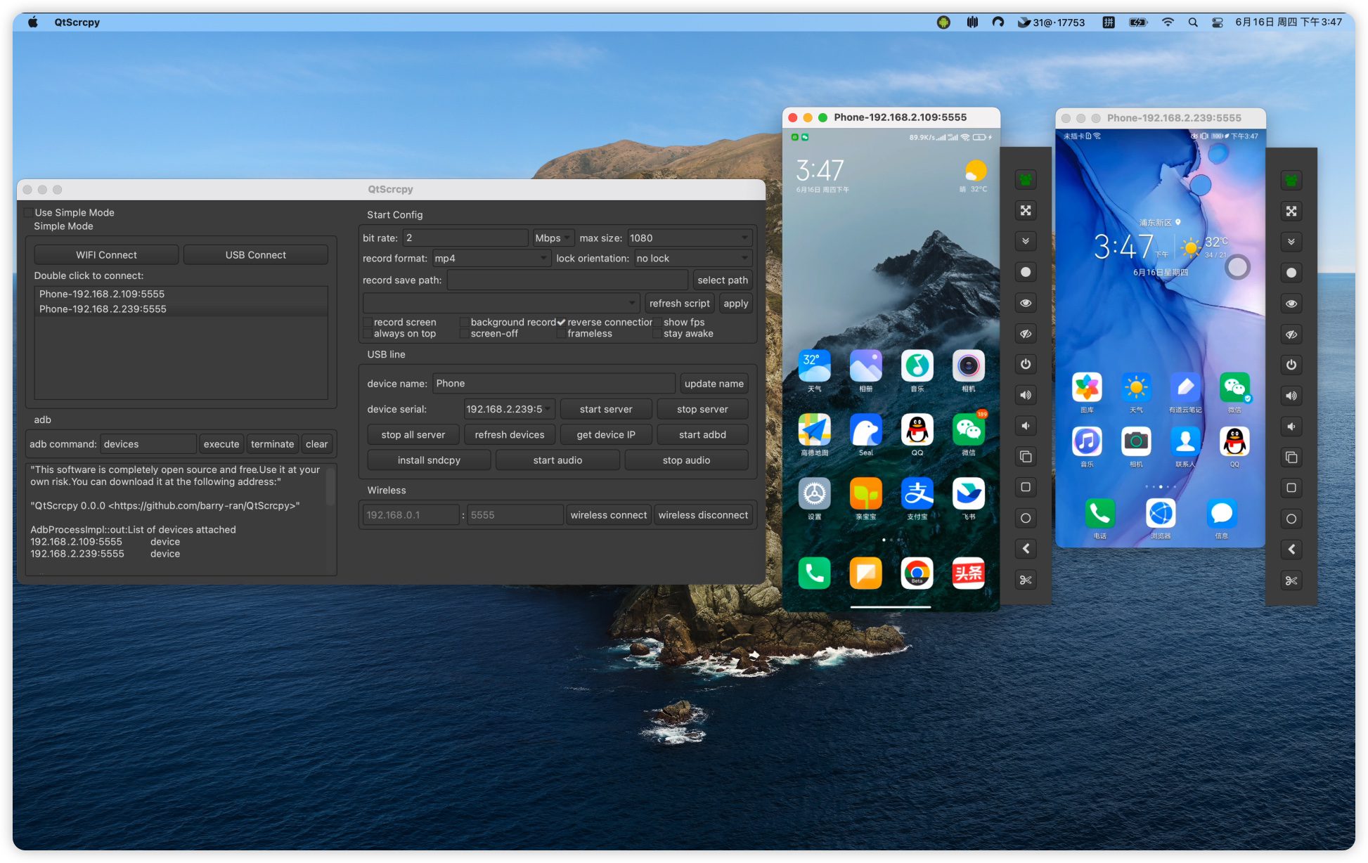 在macOS生态中寻找高效稳定的安卓投屏方案?QtScrcpy给出了开源答案!这款跨平台工具通过ADB协议将Android设备画面实时镜像到Mac屏幕,突破系统壁垒实现键鼠反向控制🚀。基于scrcpy内核与Qt框架开发,它不仅支持1080P高清投屏,更提供无线连接、跨系统文件、分辨率设置、录屏、截图传输等进阶功能,还可以通过ADB(Android调试桥)命令行进行远程控制。让Mac用户告别数据线束缚,大幅提升安卓设备管理效率。