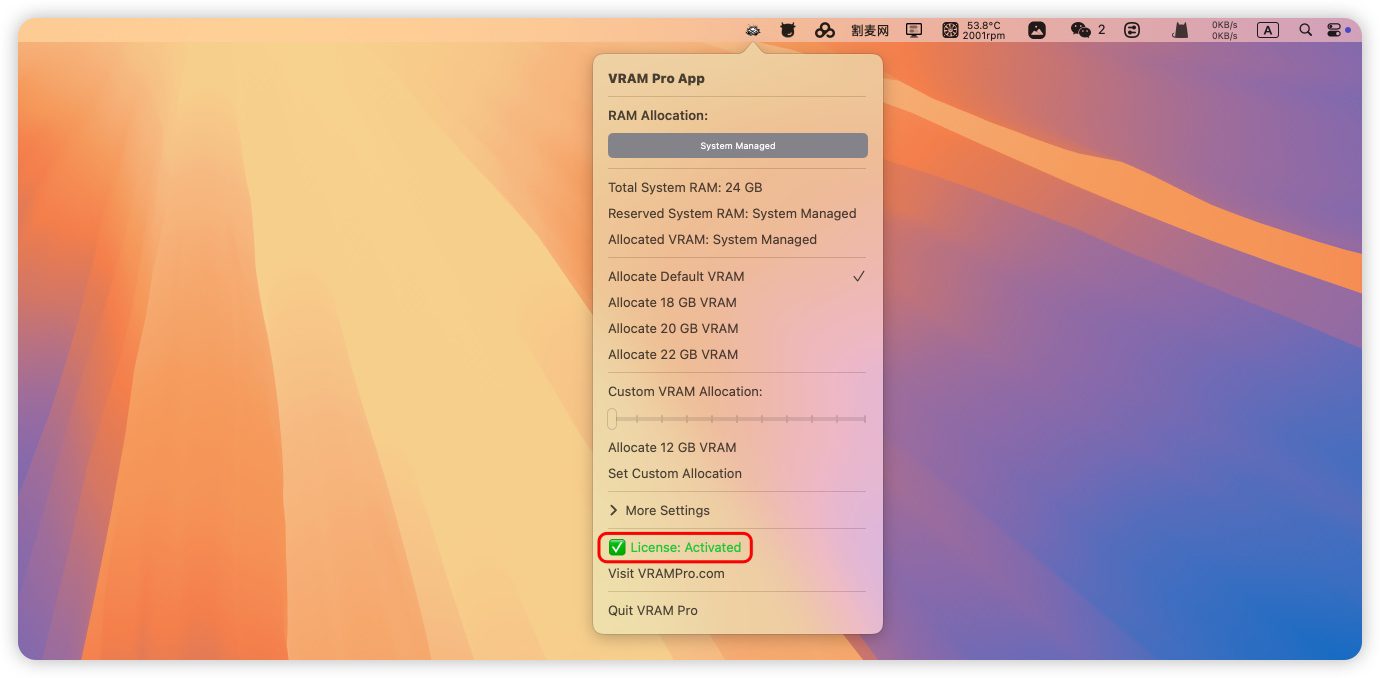 非常适合需要可预测、高吞吐量 GPU 内存访问的开发者、AI 研究人员和创意人员。无论您是在运行本地转换器还是编辑 8K 素材,VRAM Pro 都能帮助您的 Mac 达到最佳性能。