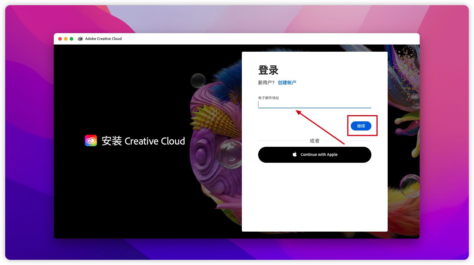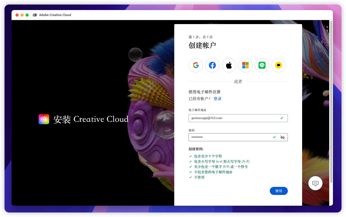 4.输入账号,点击继续(未注册的点击创建账号,地区建议选择中国)