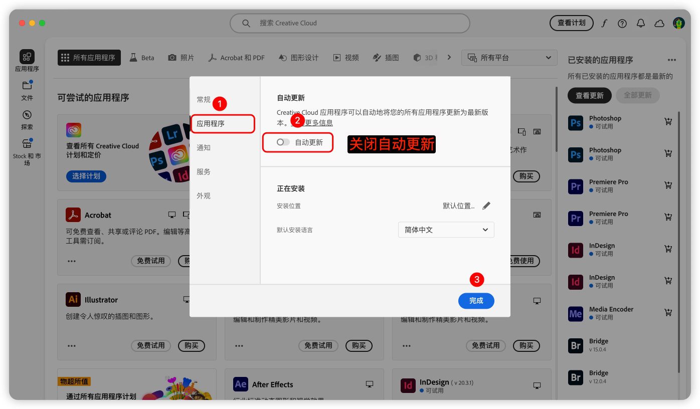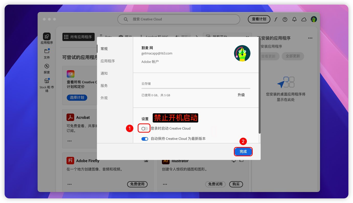 6.取消Creative Cloud开机启动和关闭Adobe软件自动更新(防止破解失效),如图